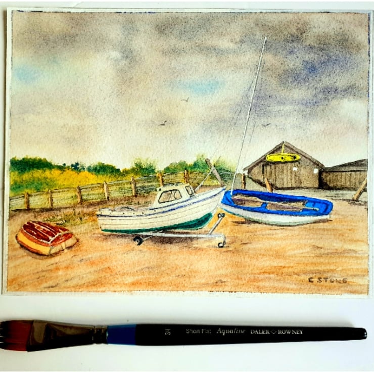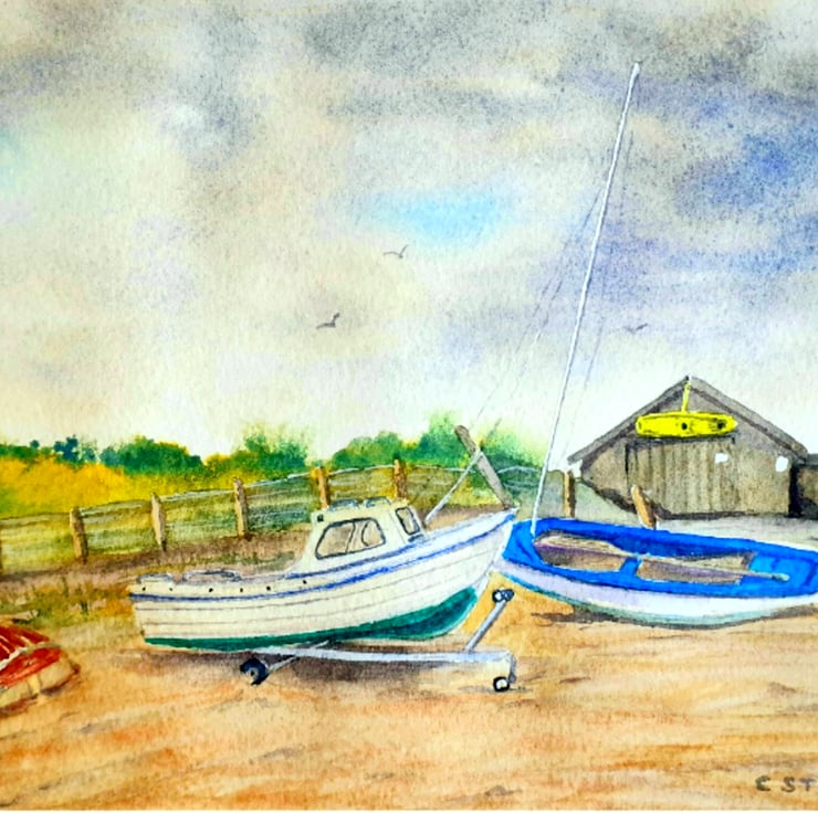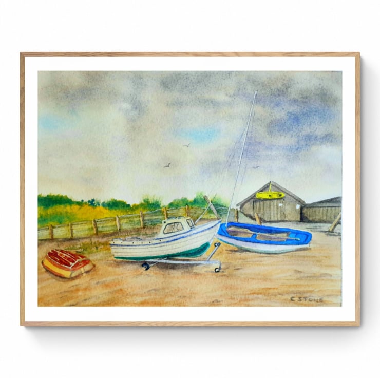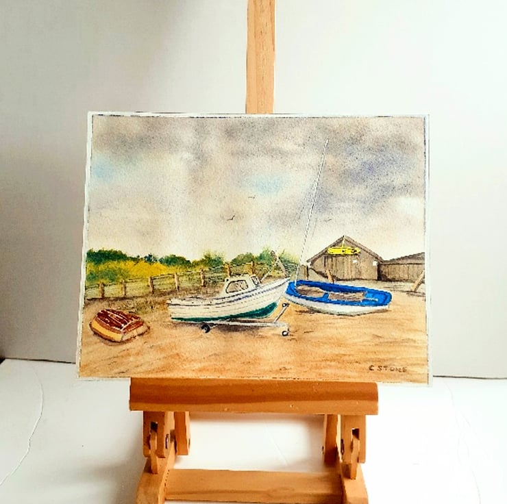 This small original watercolour was inspired by a visit to Pentewan beach in Cornwall, where I found a collection of boats, semi-abandoned at the back of the beach. I hoped they would all see action again on the next sunny day.