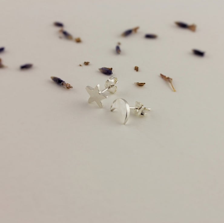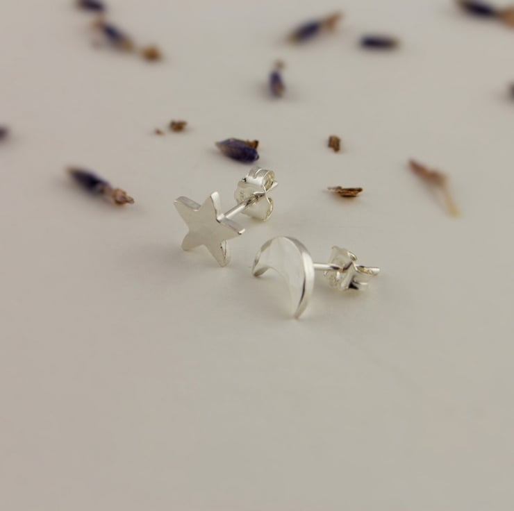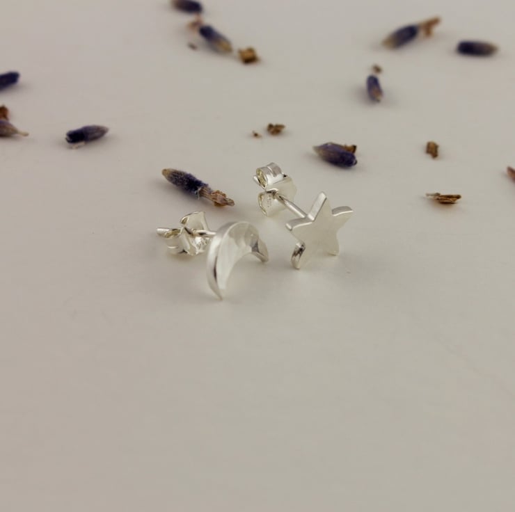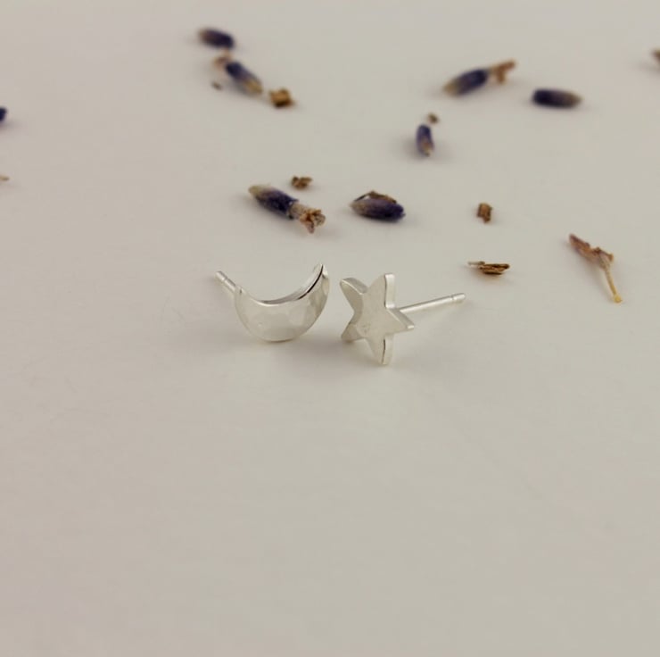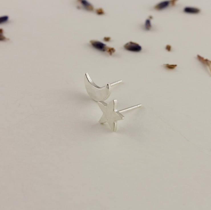 A pair of mismatched small fine silver star and moon stud earrings with sterling silver posts and butterfly backs to secure earring.