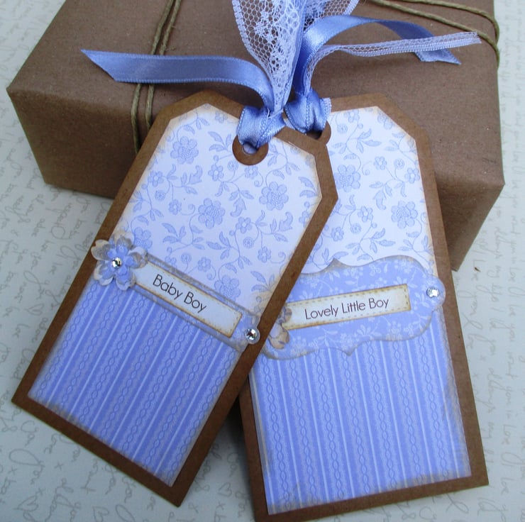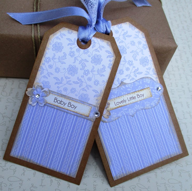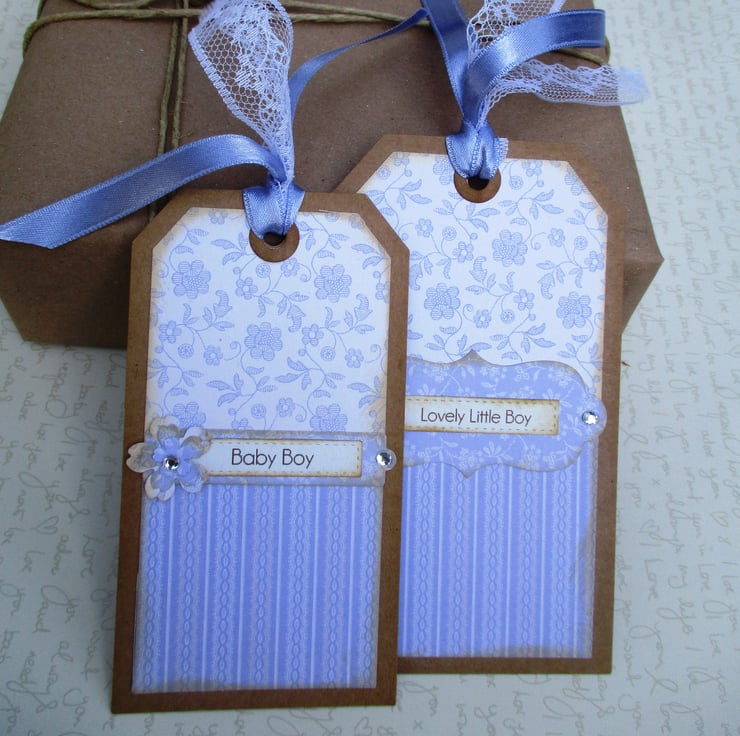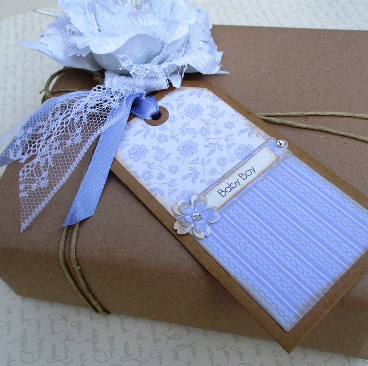 Baby boy gift tags, made with heavyweight kraft card and layered with pretty papers, ink aged around the edges,threaded with lace and ribbon and decorated with paper flowers and a greetings banner.