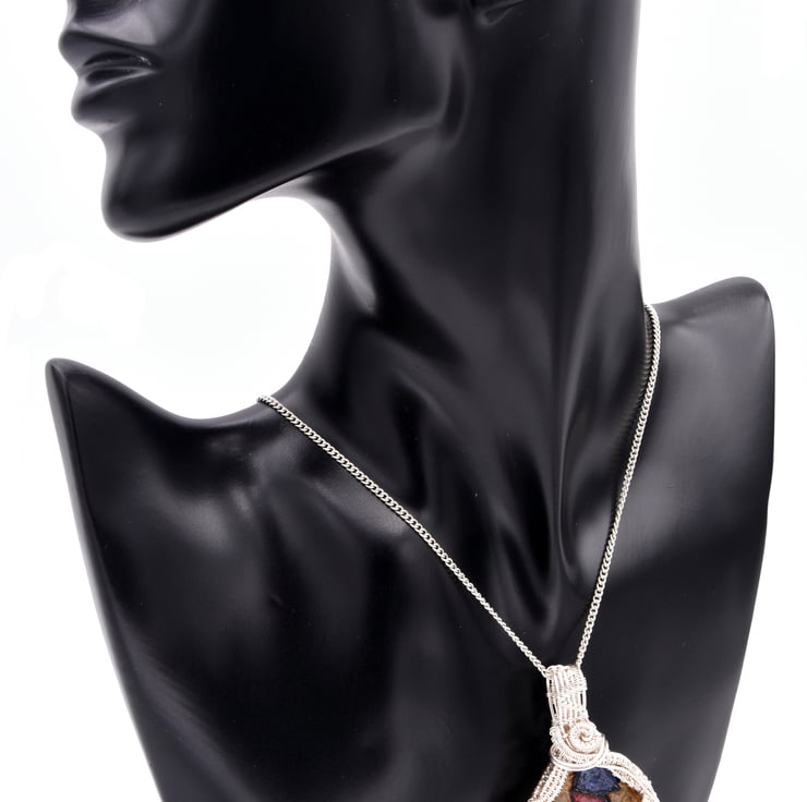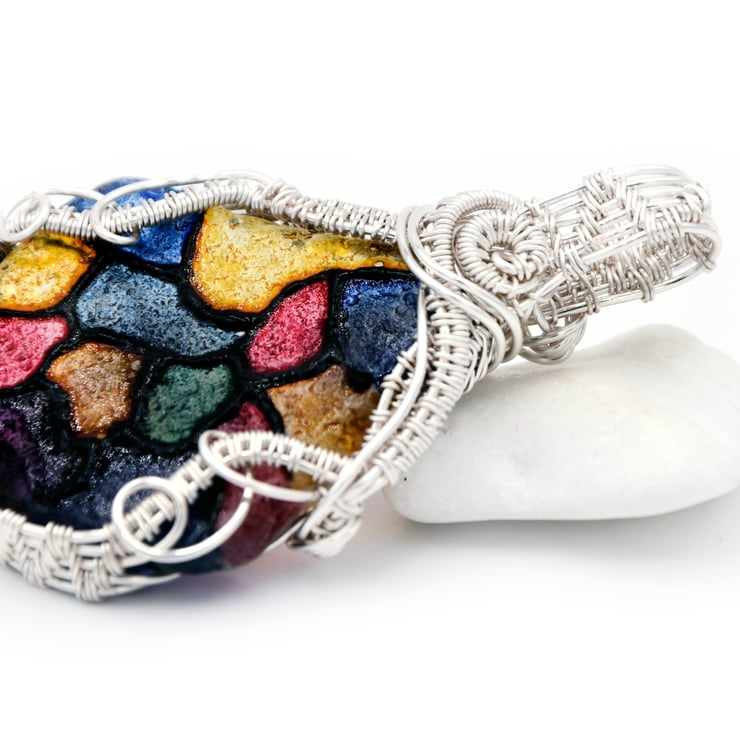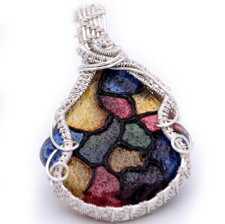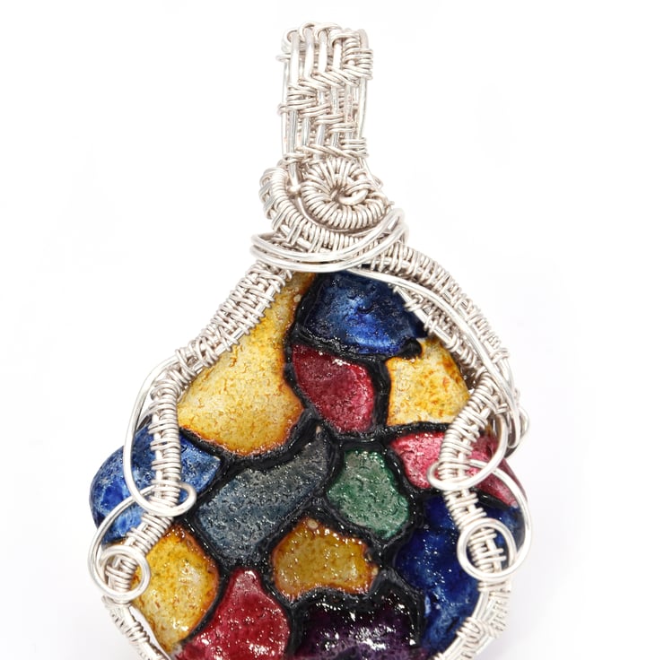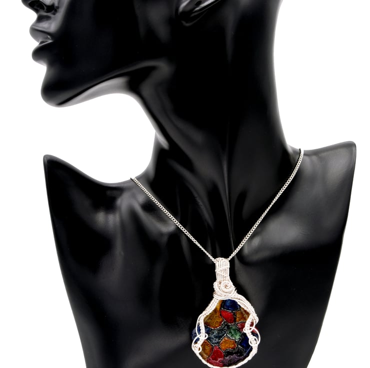 The wrapping that finishes the pendant is made using tarnish resistant silver plated copper wire.