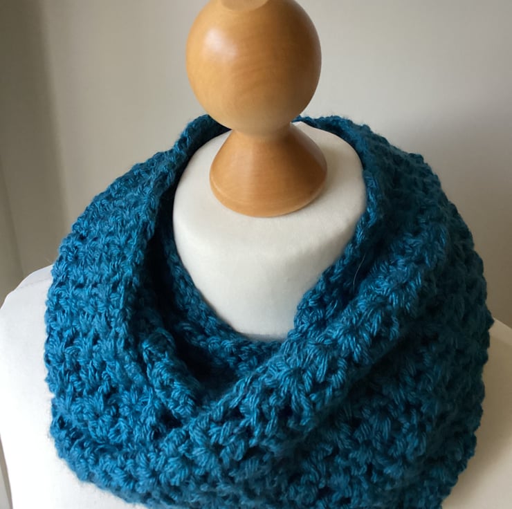 In a gorgeous teal colour which has a subtle sheen to it. This yarn has some Merino wool in it, which is soft and warm and far less likely to itch than some other types of wool.