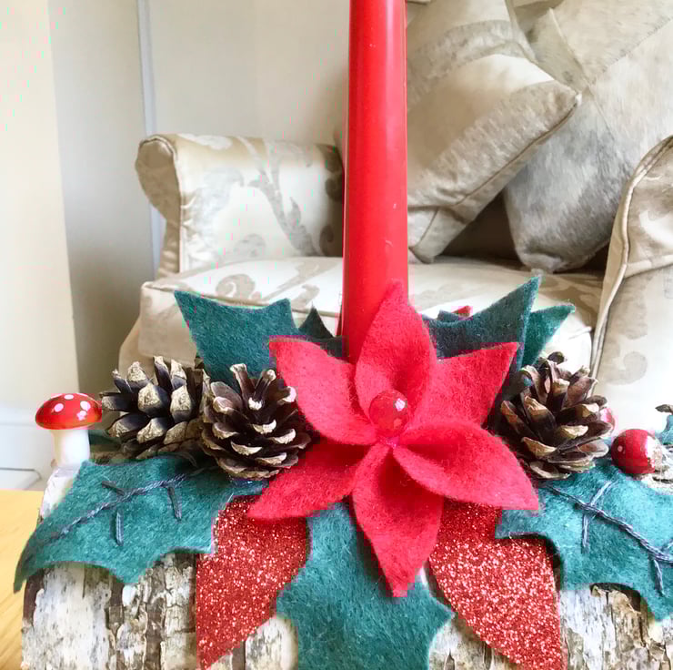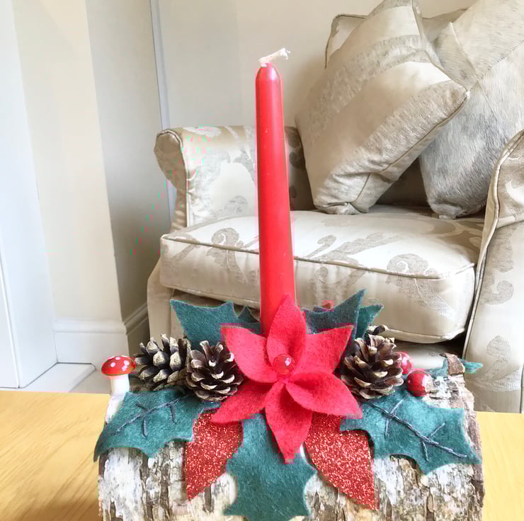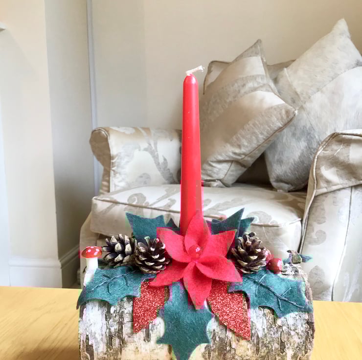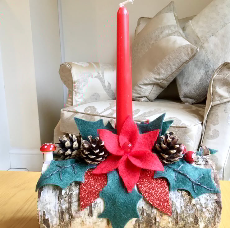 The candles are on a beautiful rustic silver birch log holder and decorated with (hand cut) felt holly, pine cones, artificial berries and other decorations. Everything on it is everlasting.