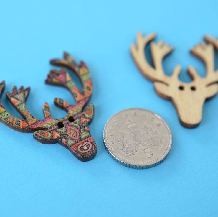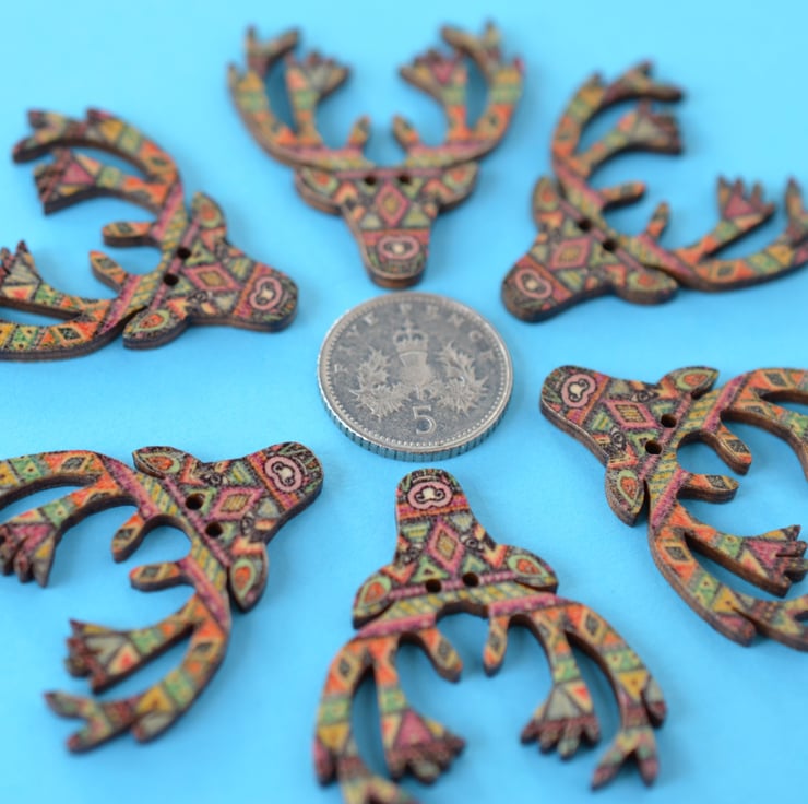 Wooden Stag Buttons Aztec Pattern 6pk 30x30mm Deer Antlers (STG3)