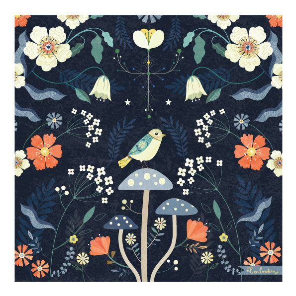 I love to make drawings inspired by the natural world and the change of the seasons. The idea for this print came about when I discovered some large mushrooms at the bottom of an oak tree near our garden. I could hear bird song above me and the idea of birds hopping from mushroom to mushroom amongst the flora and fauna was born!