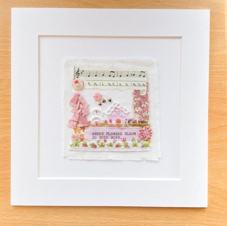 Textile collage made using a variety of different media and techniques. A layered design using linen, lace, hand embroidery and vintage sheet music. A foxglove has been appliquéd along side a pink chicken coop and a lace beehive.