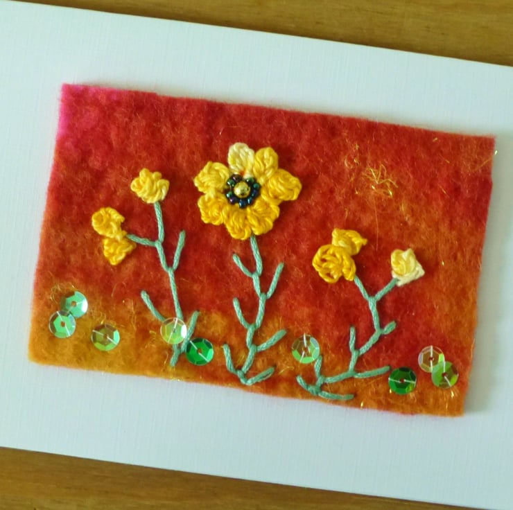 This is a unique card made from handmade felt. Beautiful orange flowers have been hand embroidered onto a gold sparkly piece of felt. The design has been embellished with beads and sequins.