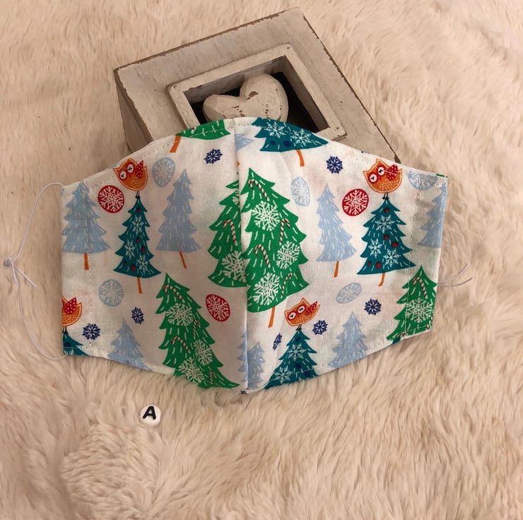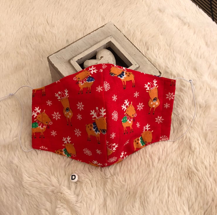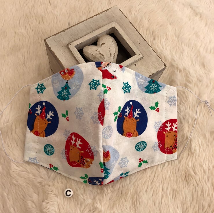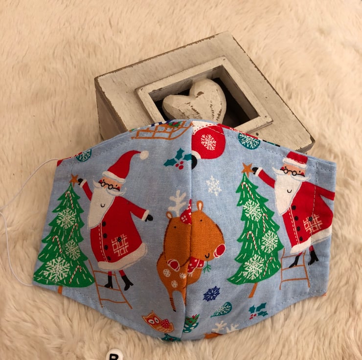 These handmade face masks are made of 100% Cotton.They are washable,breathable and reusable.They have thin adjustable elastic ear loops.Just untie and hide knot in side They come in a range of Christmas Designs.Colour Options A:White/Christmas Trees.B:Pale Blue/Christmas Trees.C:White/Circle reindeer.D:Red reindeer.E:Royal Blue/Santa..Please see my little shop for more colours and pattern designs.