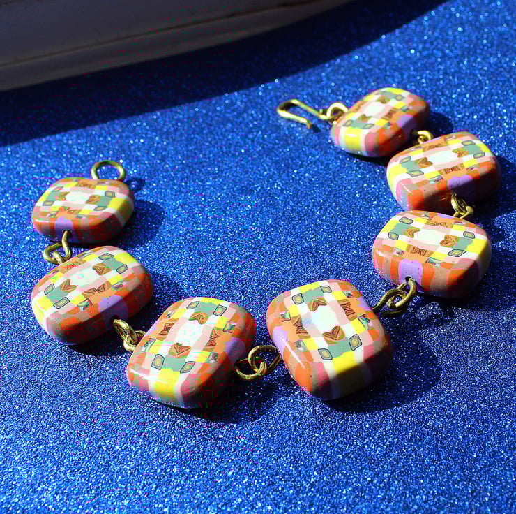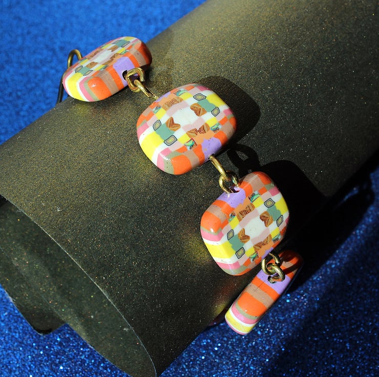 The bracelet is composed of mosaic pattern, artisan, abstract flowery tiles made from polymer clay. This is excellent, lightweight and hard-wearing material that will keep its rich tones for many years. The fairly abstract minimalist flowery design is one of my own. The tiles, 7 in total, are linked together with brass wire links, giving very reliable links and a lovely shiny color that goes well with the flowers.