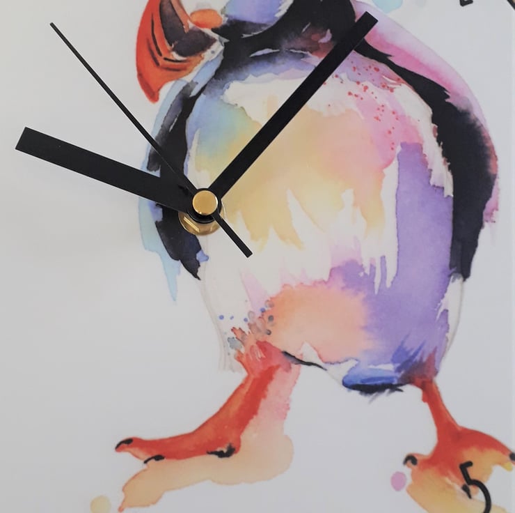 Bright and funky wall clock featuring my popular Puffin design - taken from my original watercolour painting. The clock is made from wood, measures 250mm in diameter and 5mm in depth. It takes a AA battery (which is NOT included) and comes with a hook on the back for hanging.