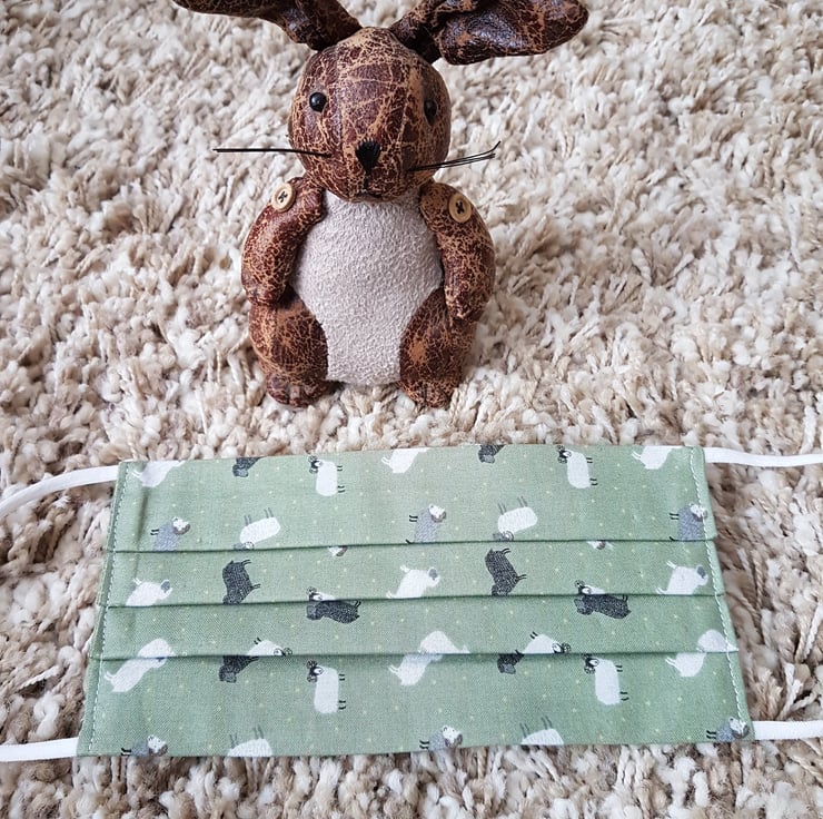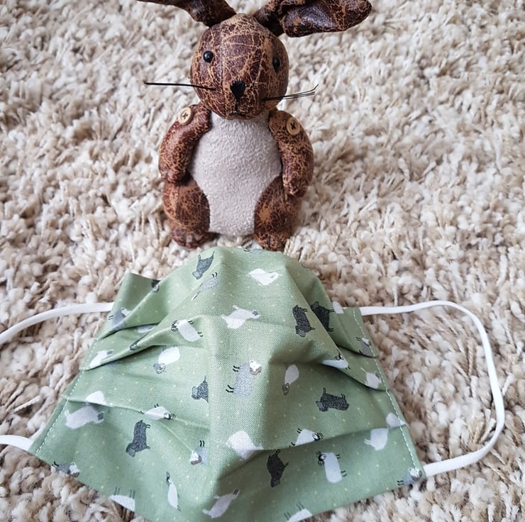 Adult face covering made from a print of mixed sheep on green cotton. The face mask is made with 2 layers of cotton forming an inner pocket for a filter (not included) and is fastened over the ears with 2 loops of elastic and a toggle adjuster.