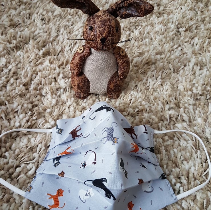 Adult face covering made from a print of lots of cats on light grey cotton. The face mask is made with 2 layers of cotton forming an inner pocket for a filter (not included) and is fastened over the ears with 2 loops of elastic.