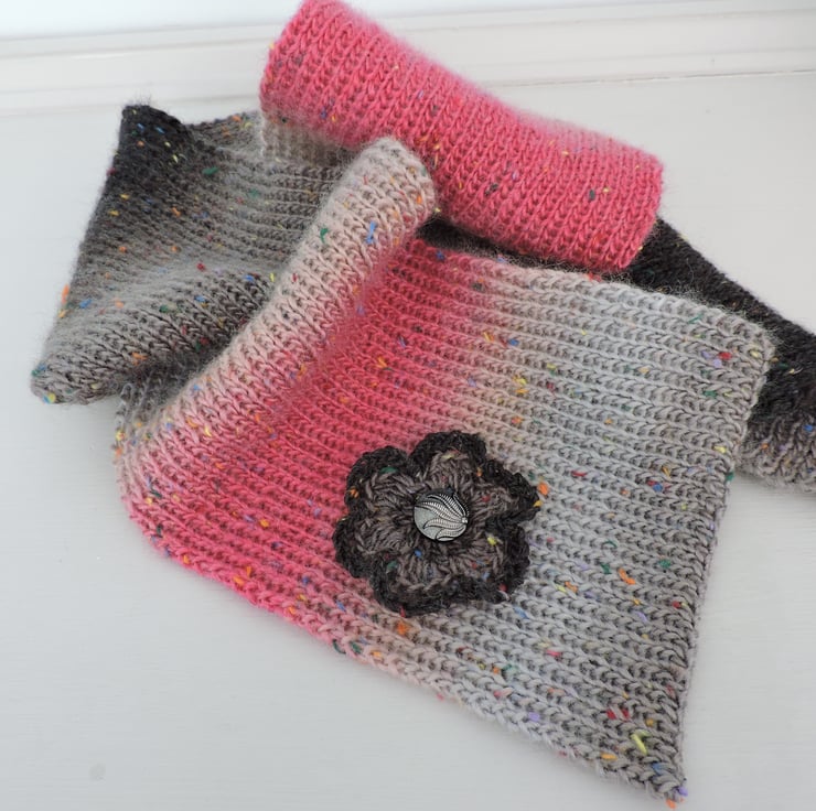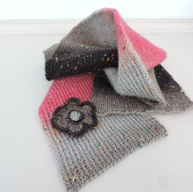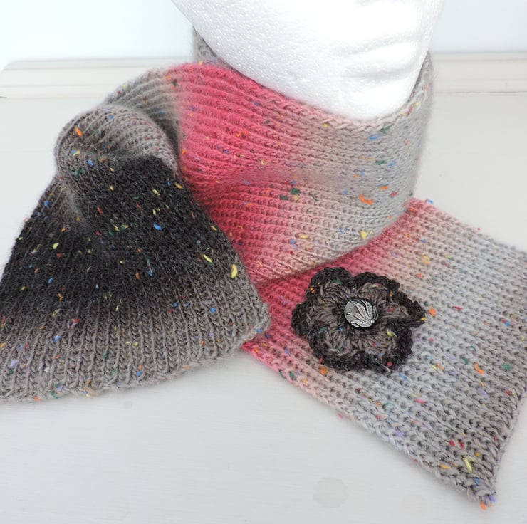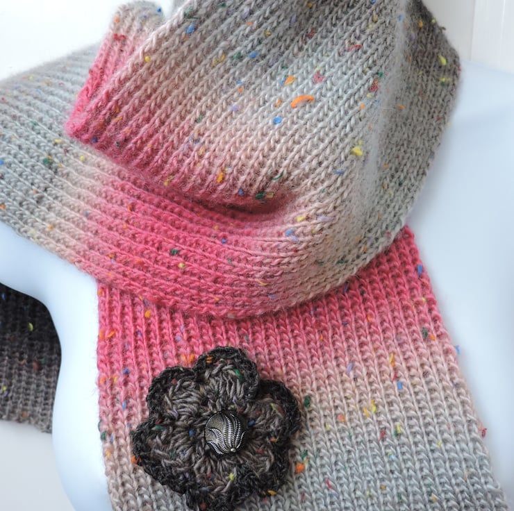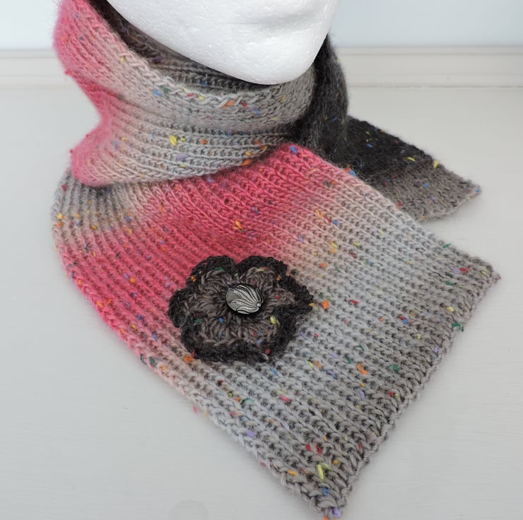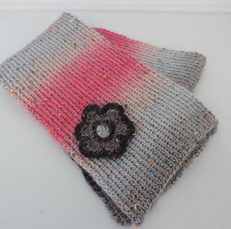This pretty scarf has been knitted in a single rib pattern with a wool and acrylic double knit yarn. Graduated colours of black, grey and pink with tweedy bits throughout.. It has been finished with a double layer crochet flower. Warm and cosy making this perfect for spring, autumn and winter weather.