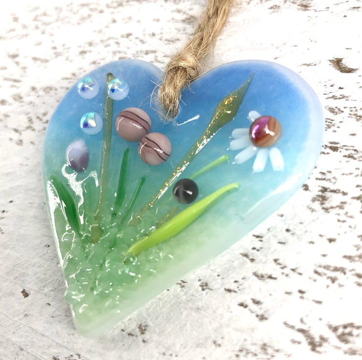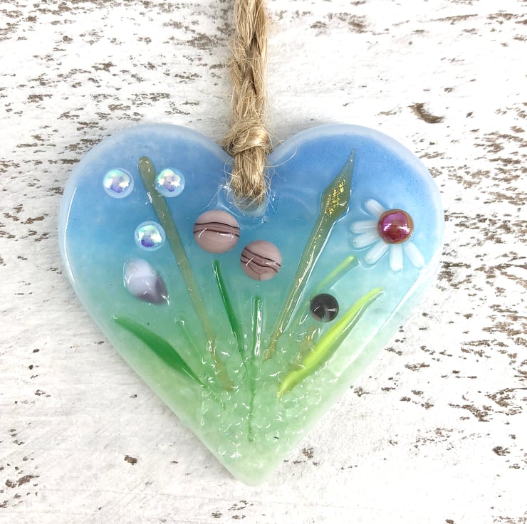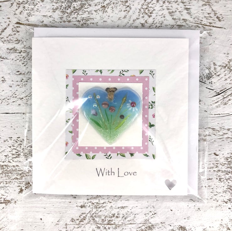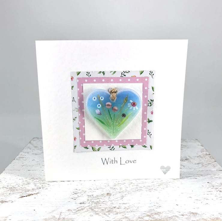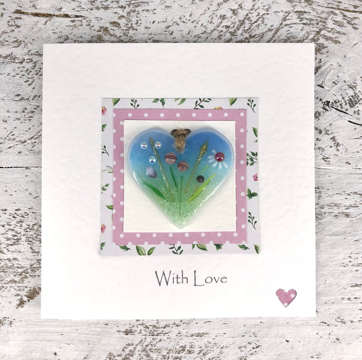 A lovely handmade card with a gorgeous fused glass heart with pink meadow flowers attached to it - the perfect card and gift in one!