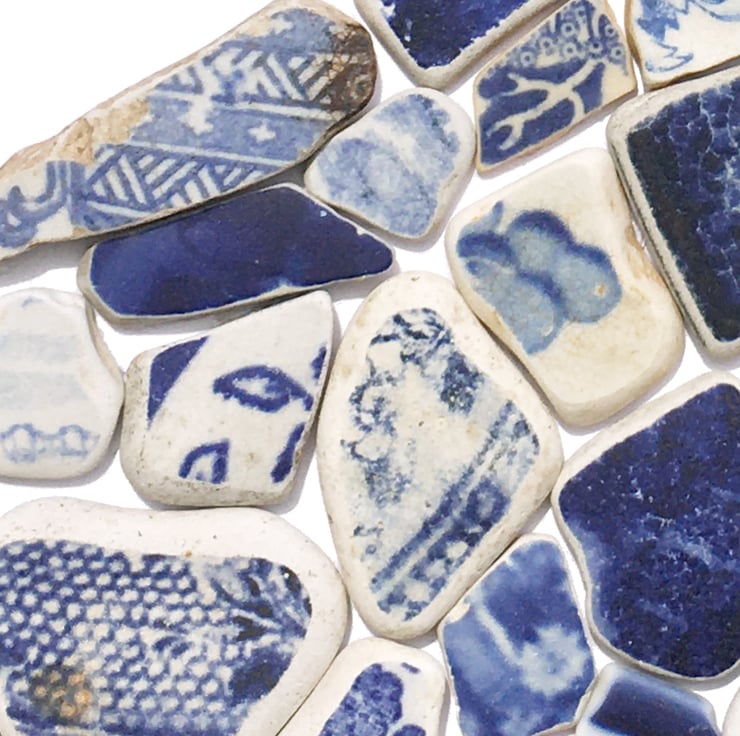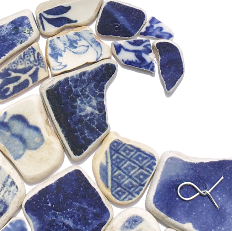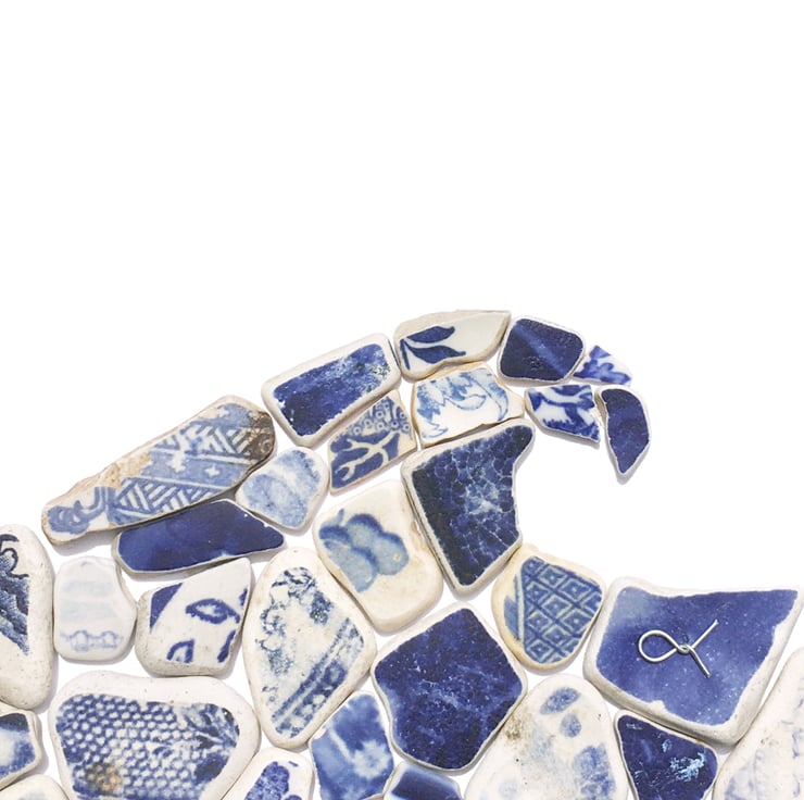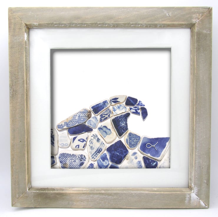 A framed mosaic using beautiful pieces of sea-worn antique blue & white beach pottery to create a lovely wave. The antique beach pottery washes up on the beautiful beaches in Anstruther, in the East Neuk of Fife in Scotland. Often featuring the famous 'willow' pattern, much of the pottery dates back to the Victorian era, when ceramic factories threw their 'seconds' into the sea and locals used to cast their broken pottery into the waves for good luck! The pottery has been gently worn smooth by the rough Scottish seas but the patterns and colours remain vibrant, a testament to the manufacturing processes of the time. I've included a photograph of the original willow pattern plate - I'm sure you'll recognise it!