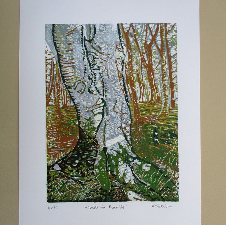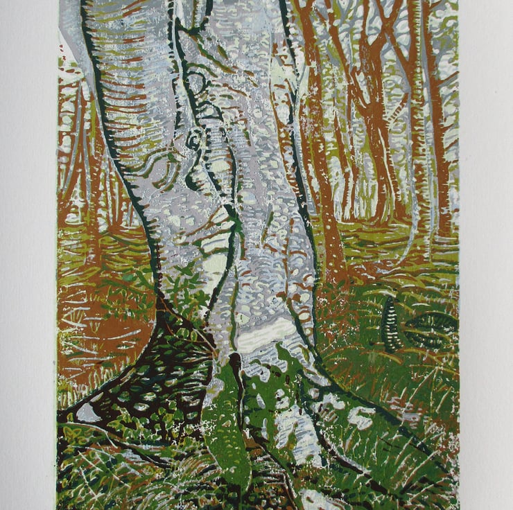 This original hand pressed linocut print takes you into a wood where a moss covered beech tree grows among the bracken and fern. It is based on photographs I took while on a walk in a Scottish wood while on holiday some years ago.