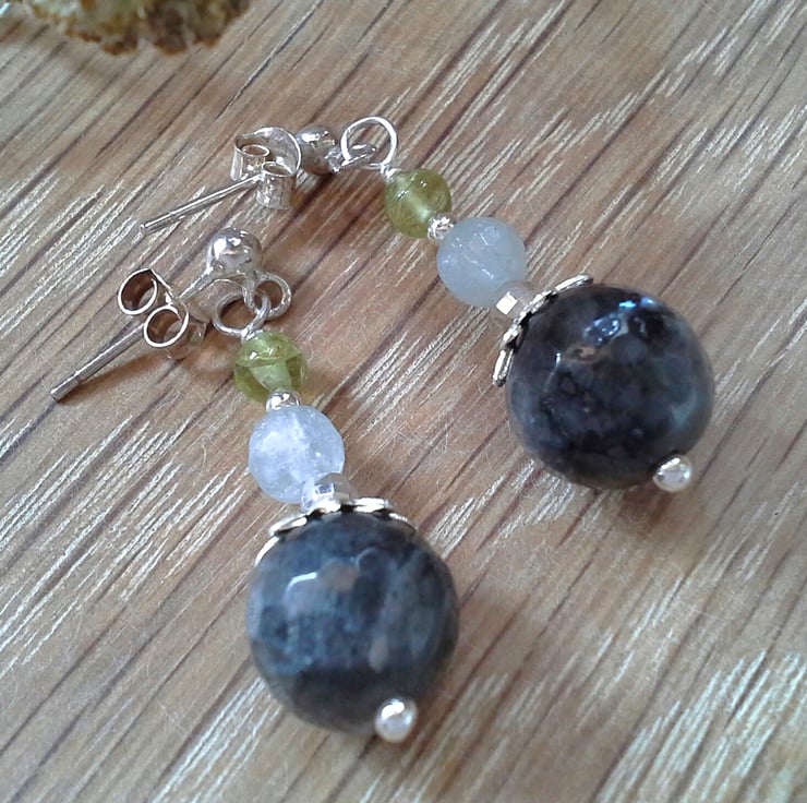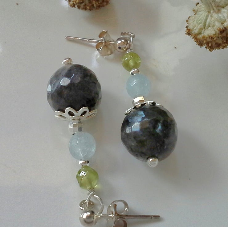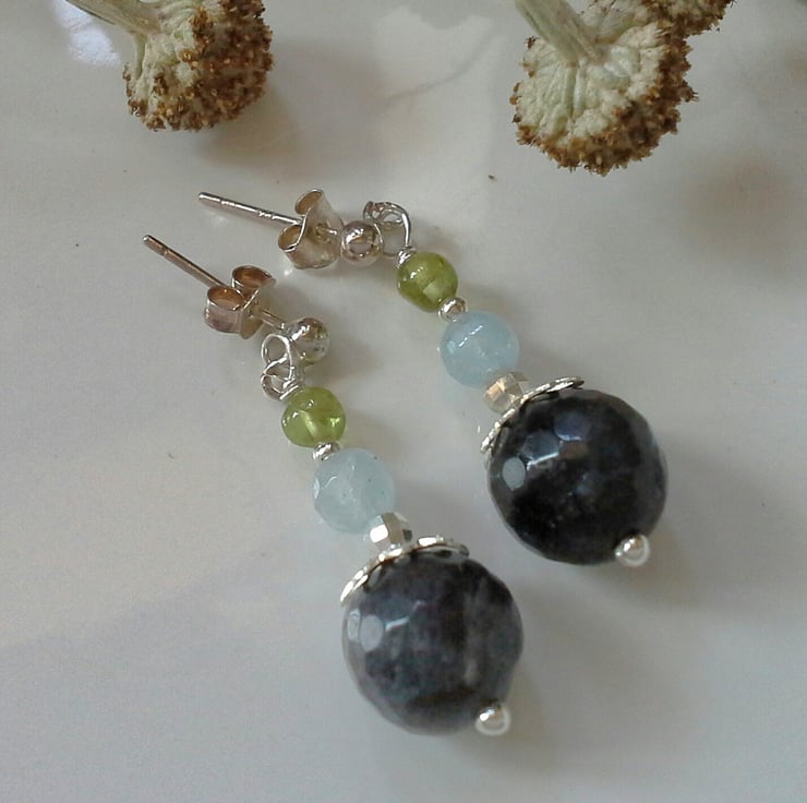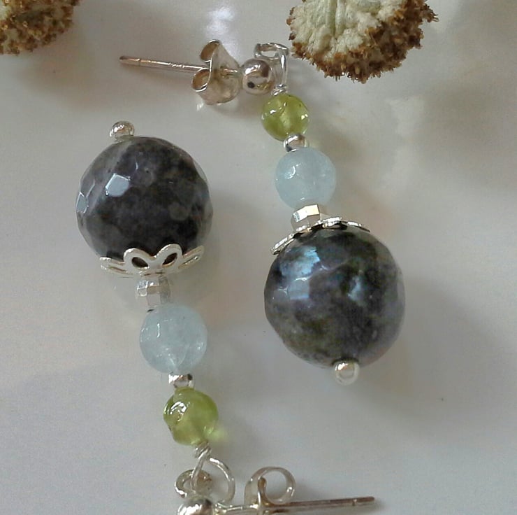 The gemstones used are 14.85cts 12mm faceted labradorite beads, 2.10cts faceted 6mm aquamarines complimented with 0.85cts of smooth 4mm peridot rounds.