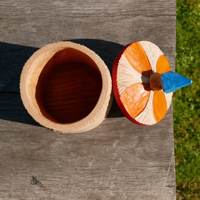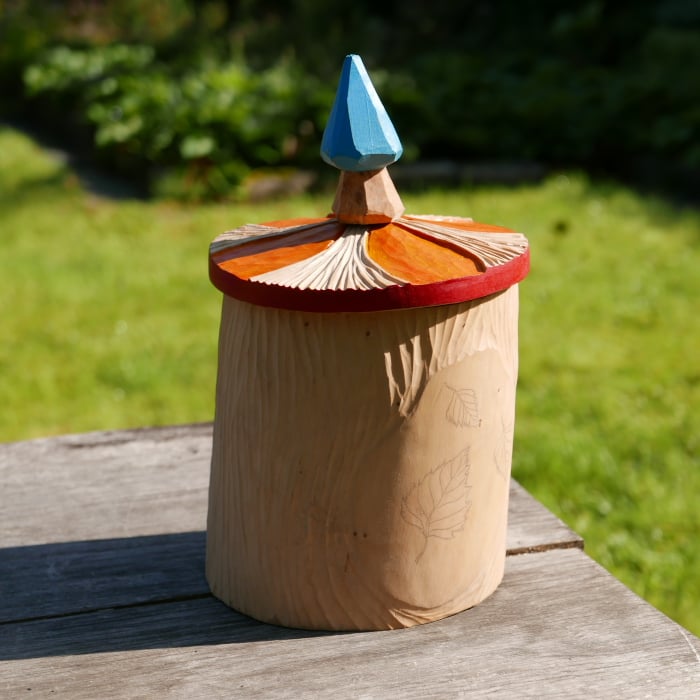 A hand carved wooden storage pot carved from Pear tree wood. Ideal for tea, coffee, lentils, beans ........or the rest!