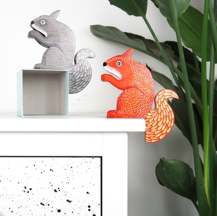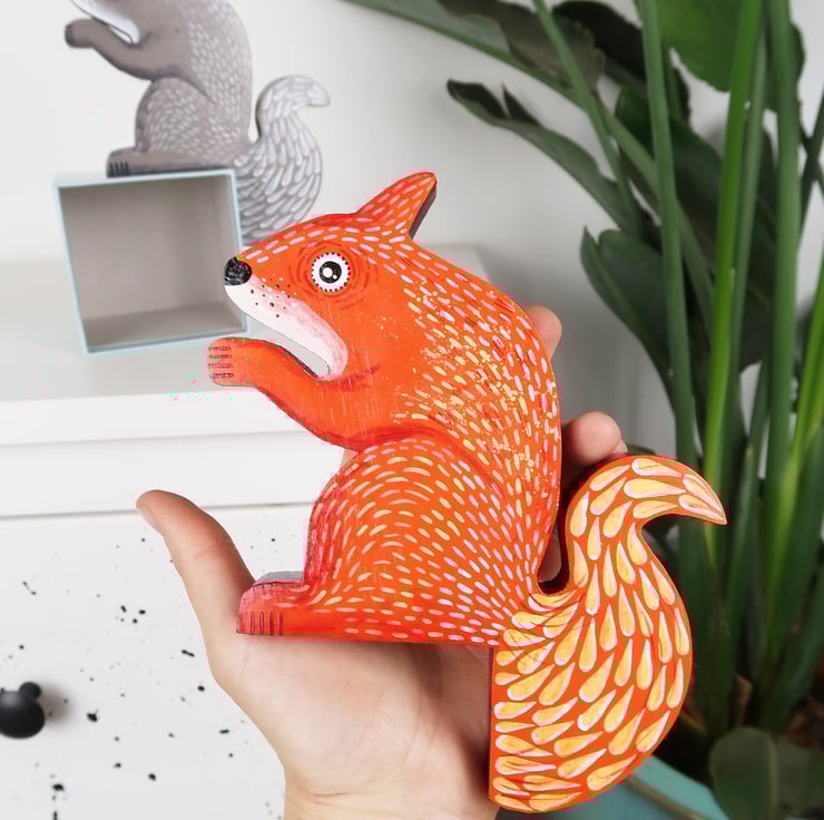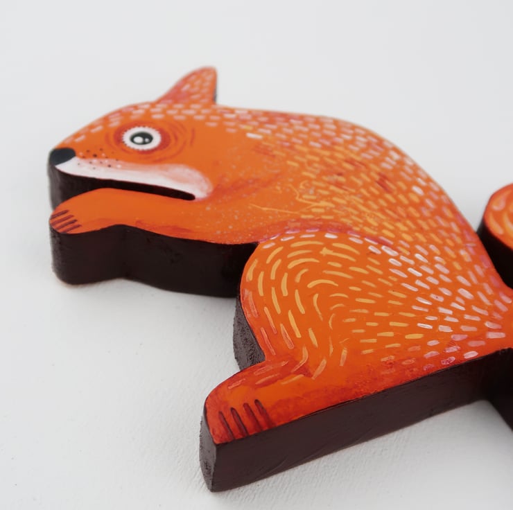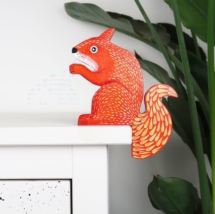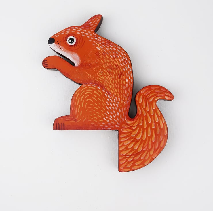 This squirrel decoration is fully hand made with love and huge attention to details. Made of pine wood & hand painted with acrylic paints. Varnished - semi gloss finish. Back is clear wood.