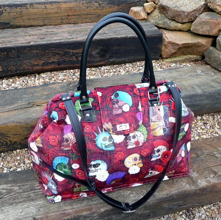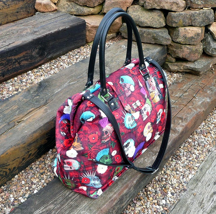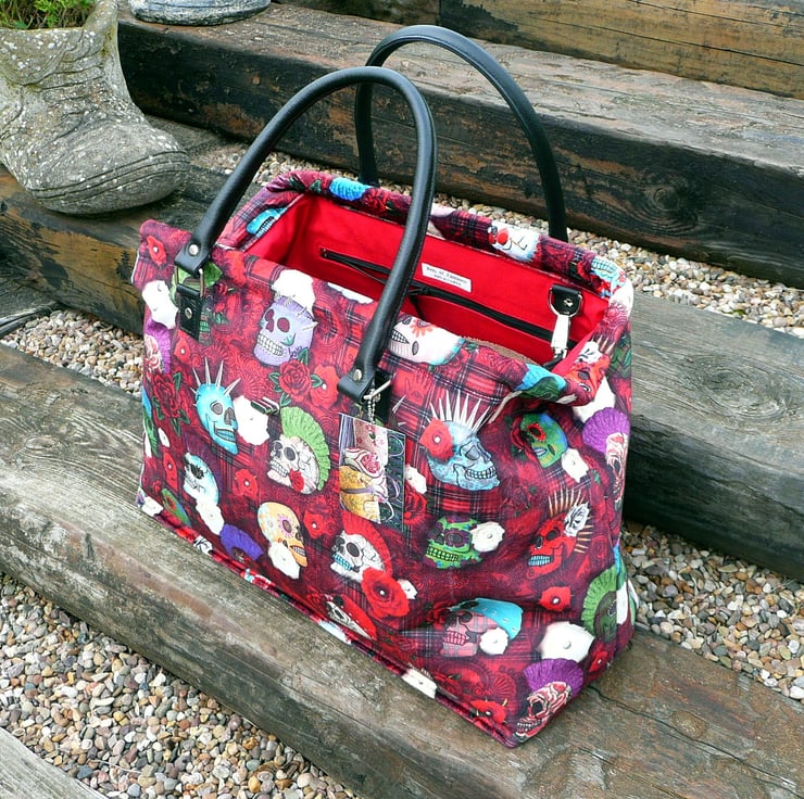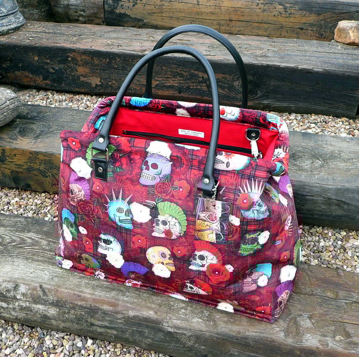 Red velvet digitally printed punk skull weekender bag, this large carpet bag features handcrafted black leather carry handles and shoulder strap, a twist bag lock, a semi solid bag base with bag feet and a spring loaded bag frame to create it's unique shape. Inside the bag is fully line in re cotton canvas and features a large zipper pocket, 2 slip pockets, a key clip and D rings for your shoulder strap. This is a large bag made from upholstery grade velvet and leather, it has lots of structure and will stand upright on it's own. Pattern placement may vary to what you see here, this one has sold but I have another one made and ready to go.