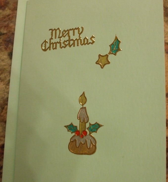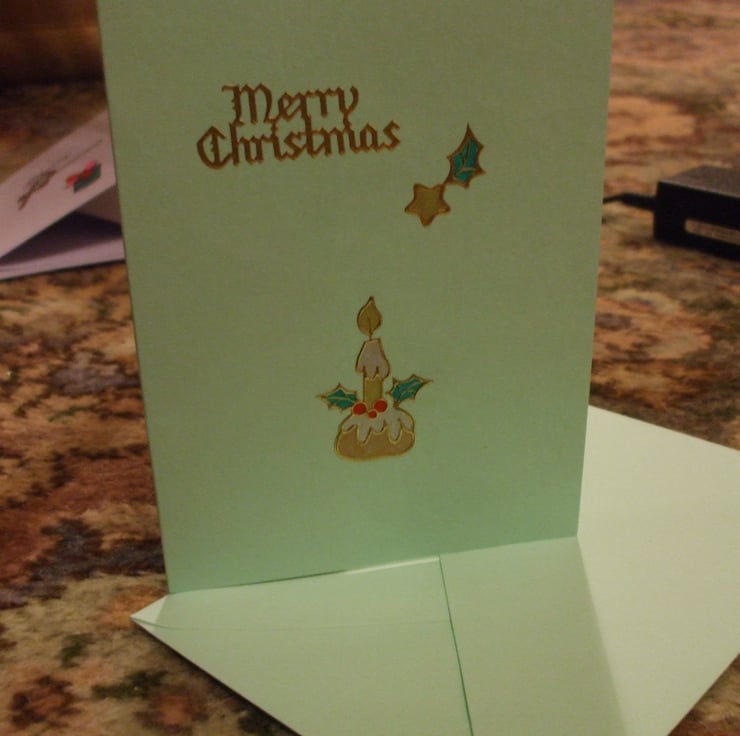 This green C6 (A6) Christmas pudding and shooting star Christmas card is blank inside for you to write your own message. I've used commercial stickers but have coloured them in myself using gel pens. The card is accompanied by an envelope of the same colour and can be sent sealed in a compostable biofilm wrapper.