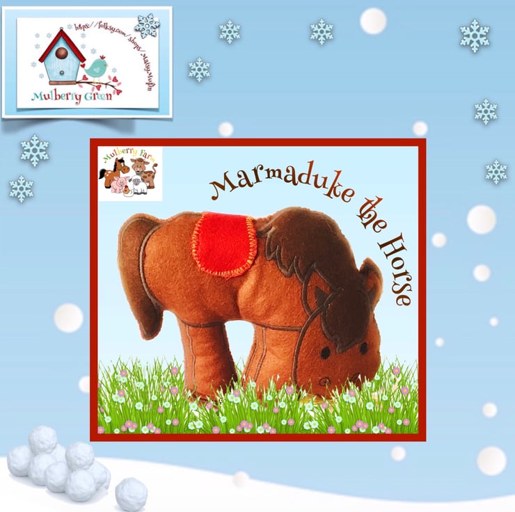 Marmaduke is an embroidered horse, made from felt. The front of Marmaduke is embroidered and the back is just plain felt.