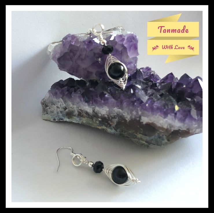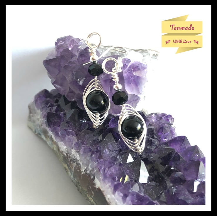 Designed with 8mm black onyx gemstone beads these earrings have been creatively wrapped by hand in a herringbone weave using a selection of silver plated copper artistic wire. This wire has an ultra thin clear coating that will inhibit tarnishing for longer. It would make you or your loved one a perfect gift for any occasion.