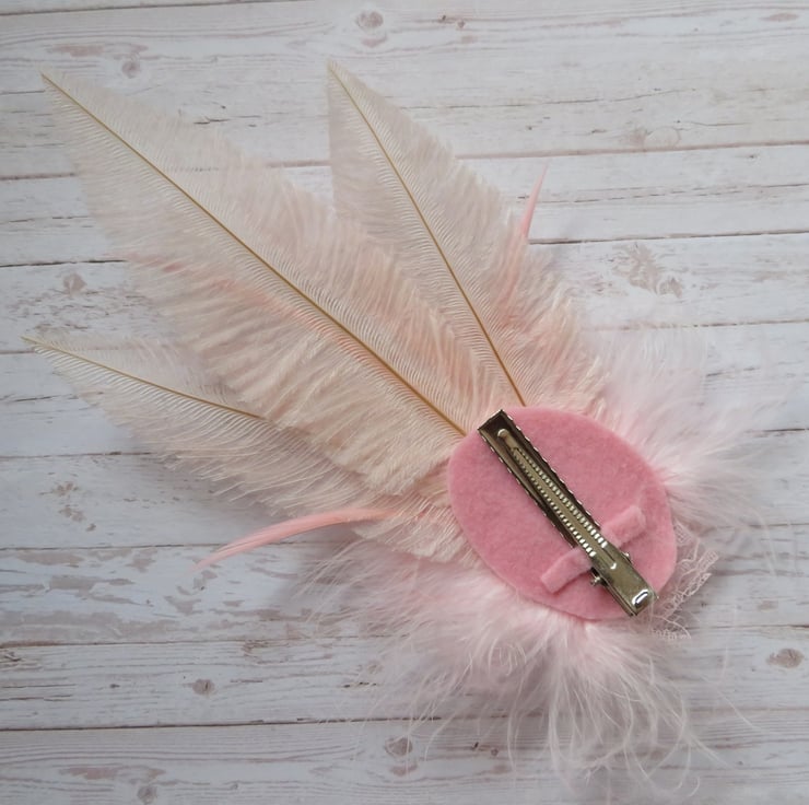 Created with three trimmed pale blush pink ostrich feathers , blush pink fluff feathers, darker pink biot feather spikes and loops.