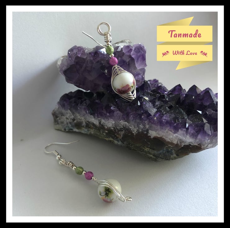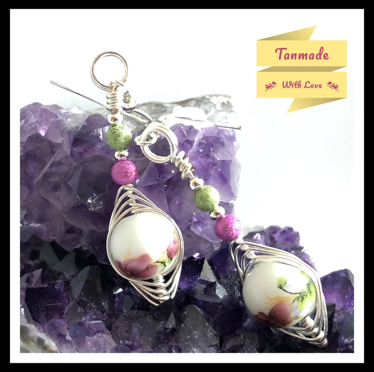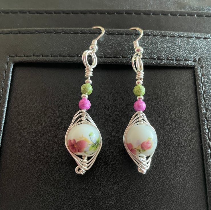 Designed around a set of beautiful glass beads these earrings have been creatively wrapped by hand in a herringbone weave using a selection of silver plated copper artistic wire. This wire has an ultra thin clear coating that will inhibit tarnishing for longer. It would make you or your loved one a perfect gift for any occasion. Measures 5.5cm