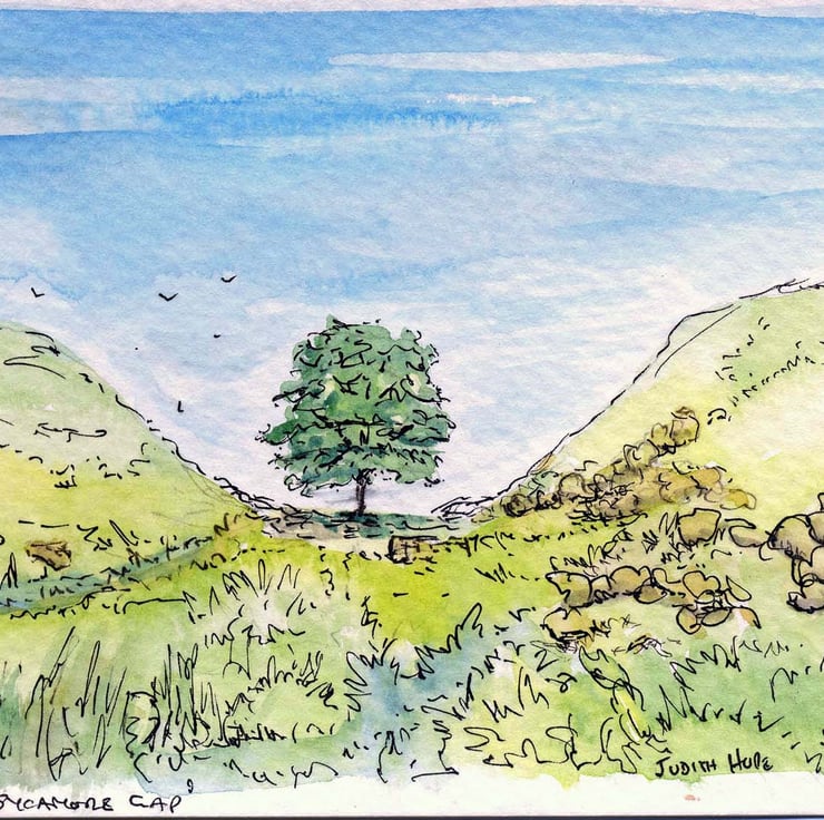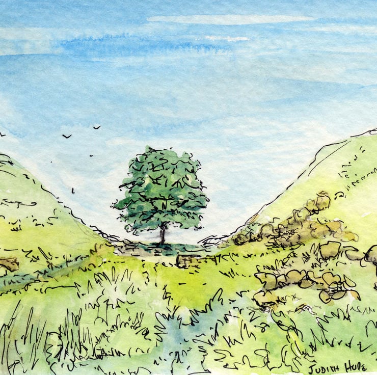 This is a little painting I made of The Sycamore Gap, on Hadrian's Wall, Northumberland. It is an original watercolour painted by me.