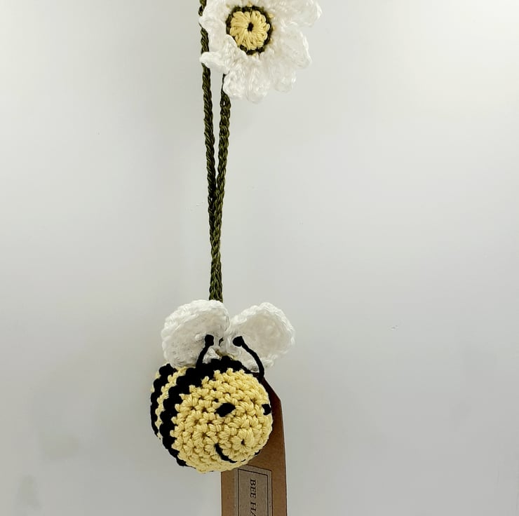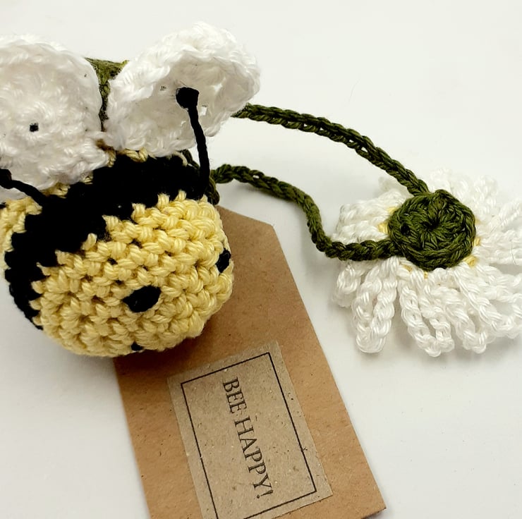 This buzzy little bee is all set to carry a message on your behalf. Ot is crocheted in cotton and filled with polyester stuffing. The bee measures approximately 6 from head to tail. It hangs from a crocheted loop with a pretty daisy at the top. The tag reads 'Bee happy!' although I am very happy to exchange this tag for one with wording of your choice.