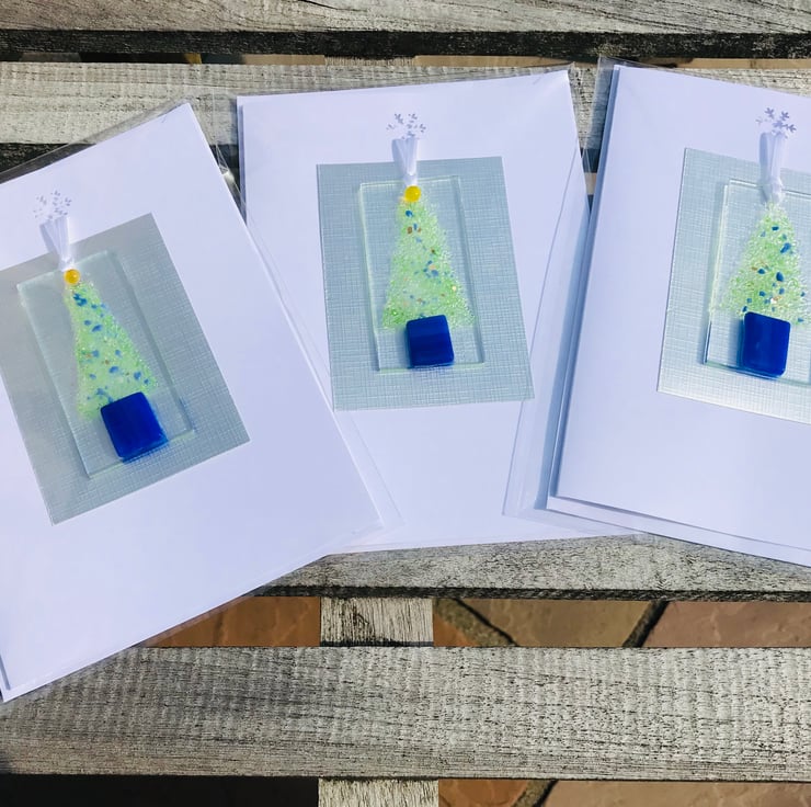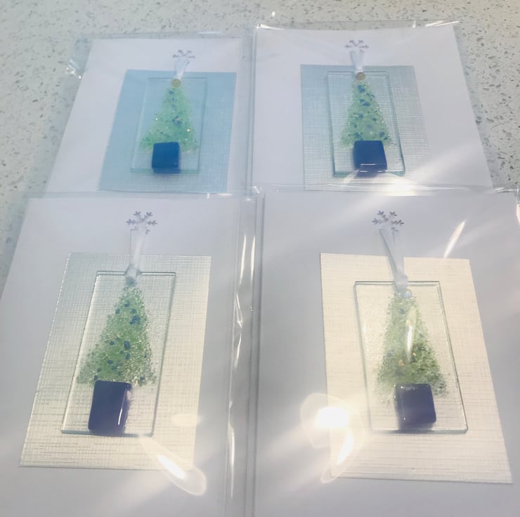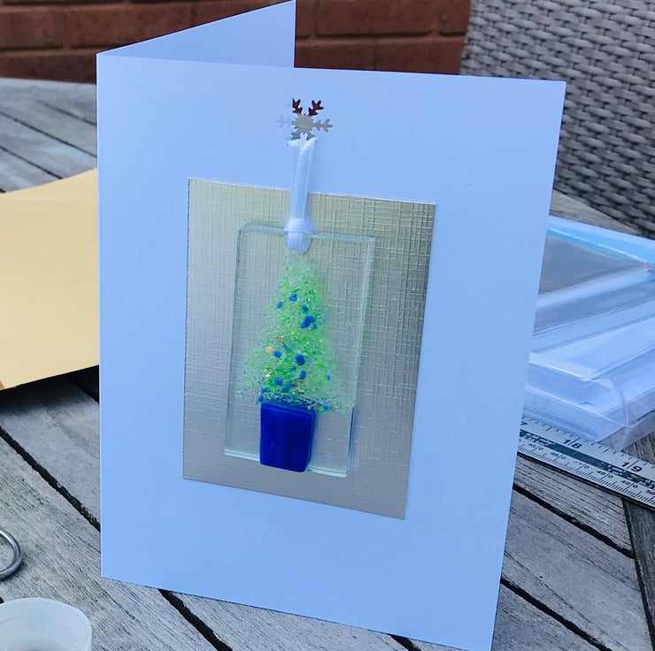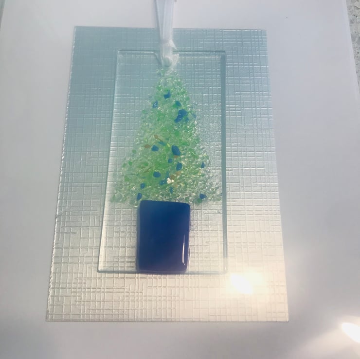 Fused glass hanging Christmas tree decoration 3 in x 1.5 inches . Small Christmas trees made by hand from fused glass and formed in my kiln . Drilled and hung with white ribbon and card made with silver card . It’s a gift and a card in one .