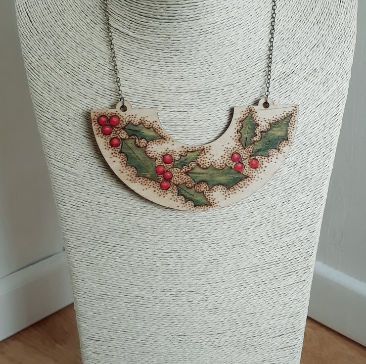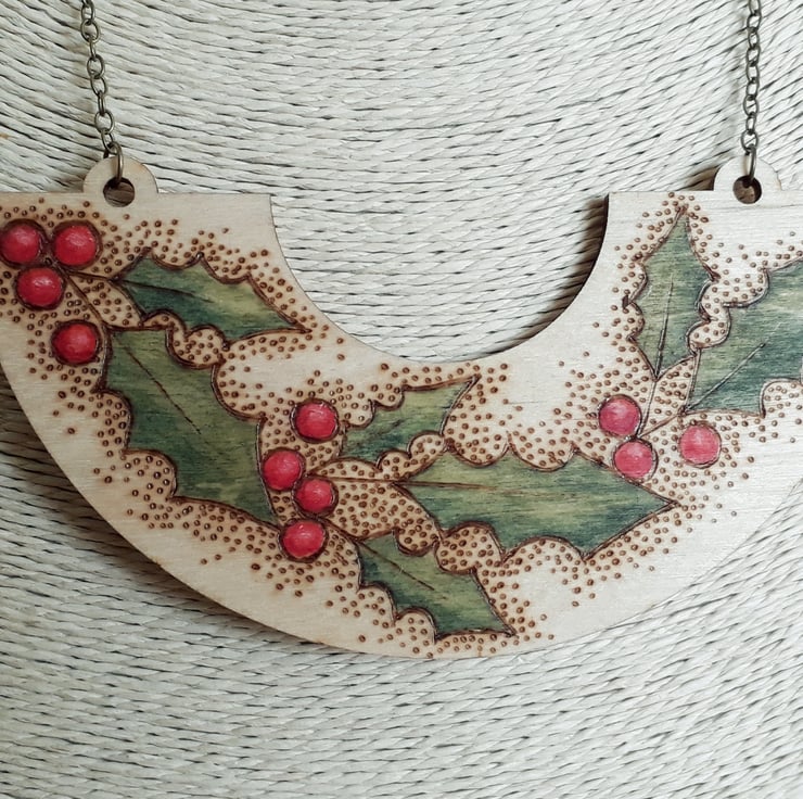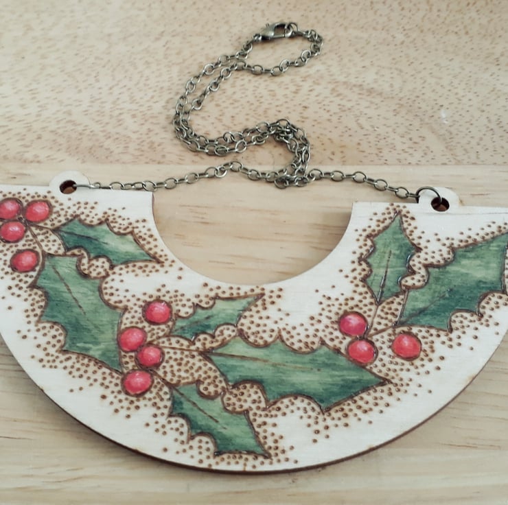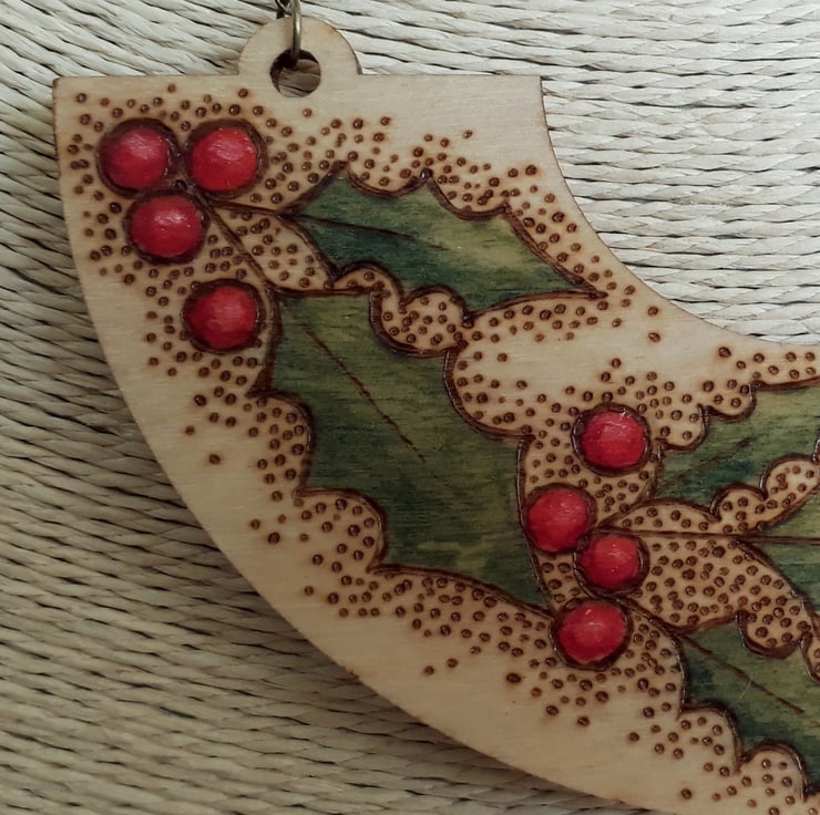 Wooden pendant illustrated with holly using pyrography (wood burning).
