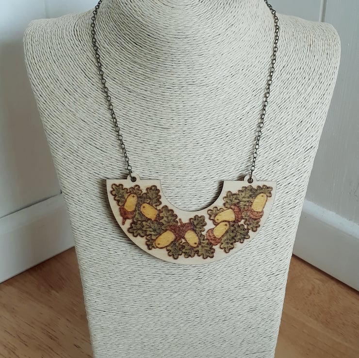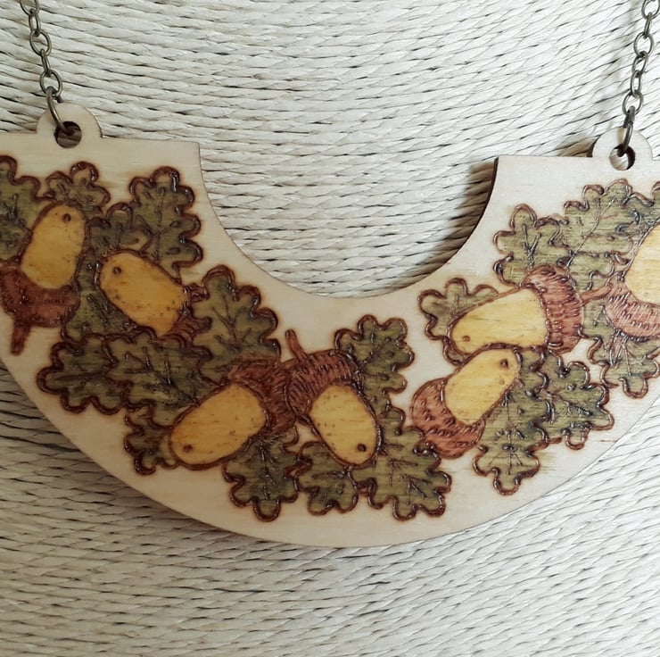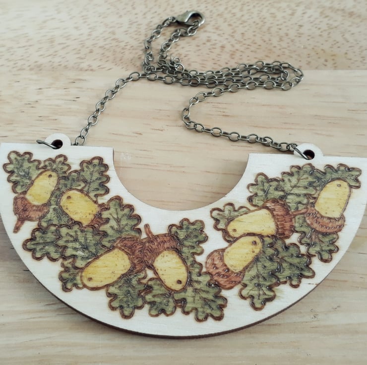 Wooden pendant illustrated with oak leaves and acorns using pyrography (wood burning).