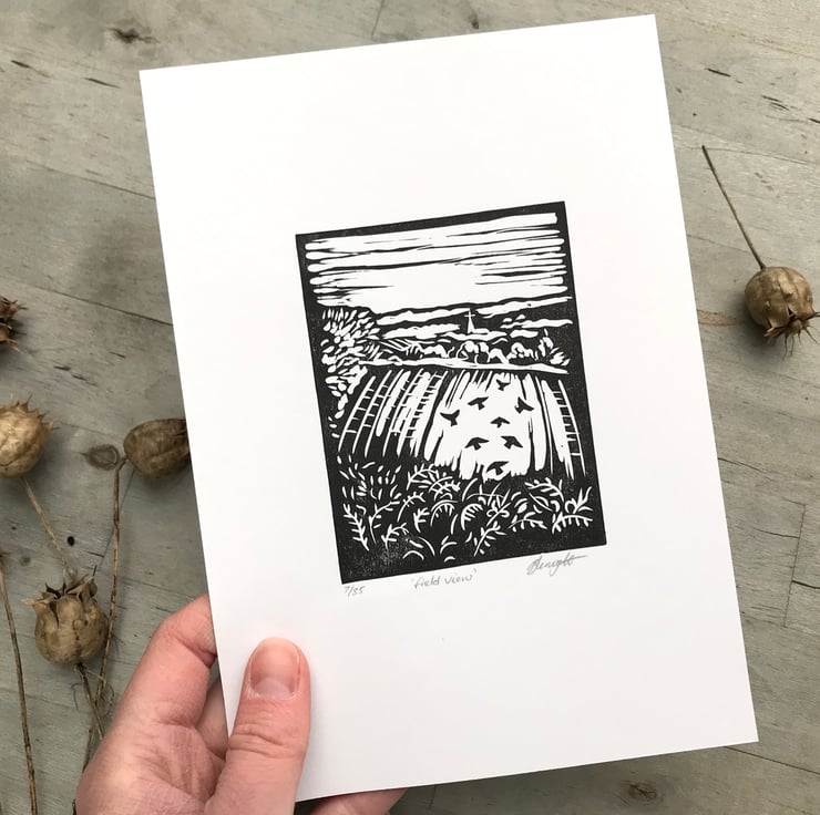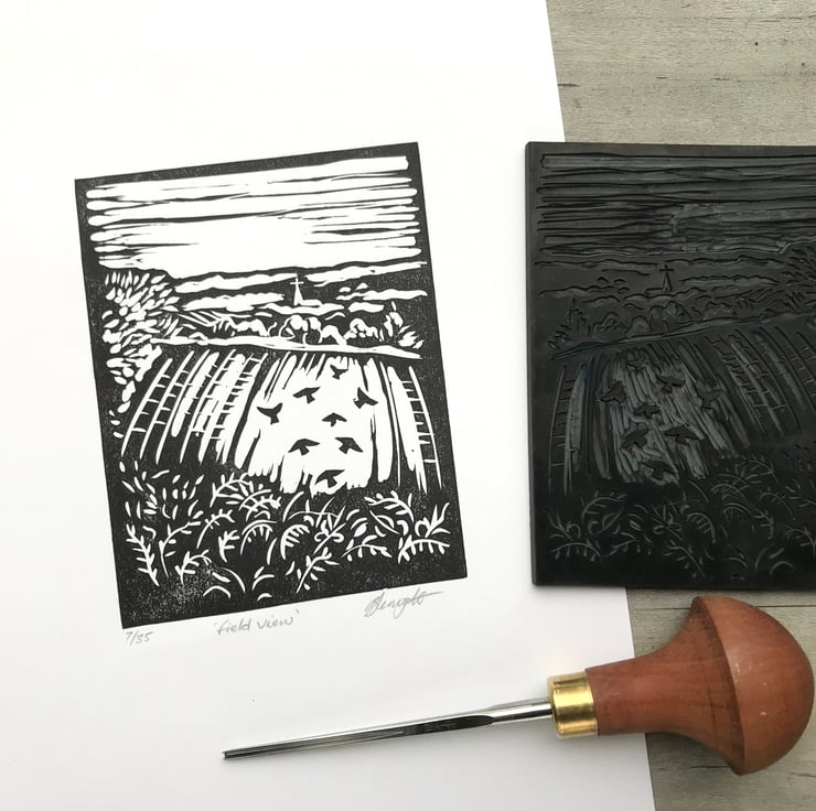 "My lino prints are often inspired by the wildlife around my home in Suffolk, I hand draw my design and then transfer it to the lino and carve out the image, ink is then applied and I print them by hand onto the paper."