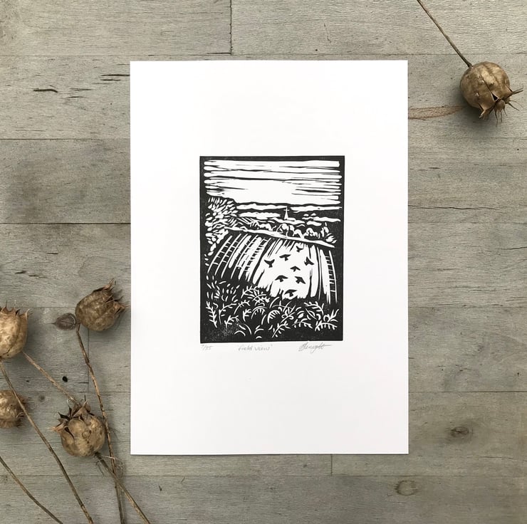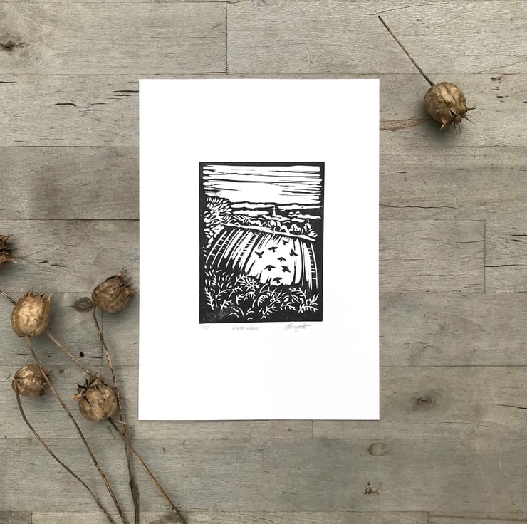 This original, limited edition lino cut print entitled "Field View" has been hand printed by printmaking artist Beth Knight on archival quality paper using light fast ACMI certified inks. Hand signed and numbered by the artist. Edition of 35.