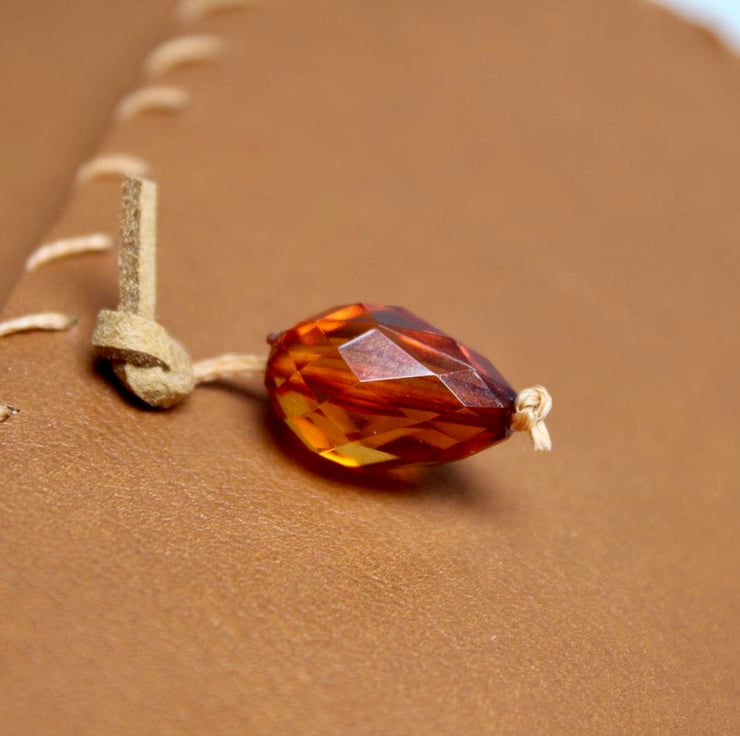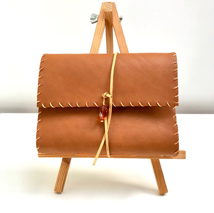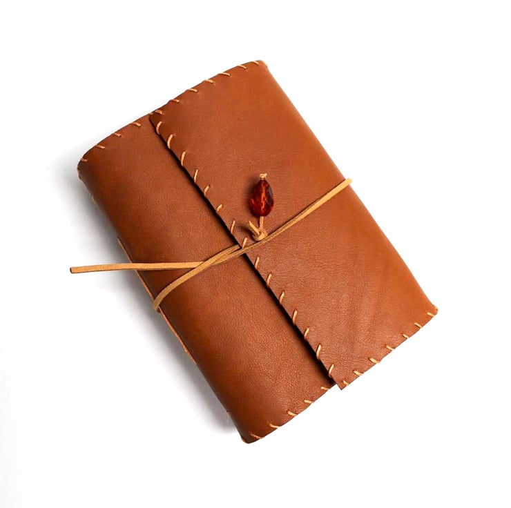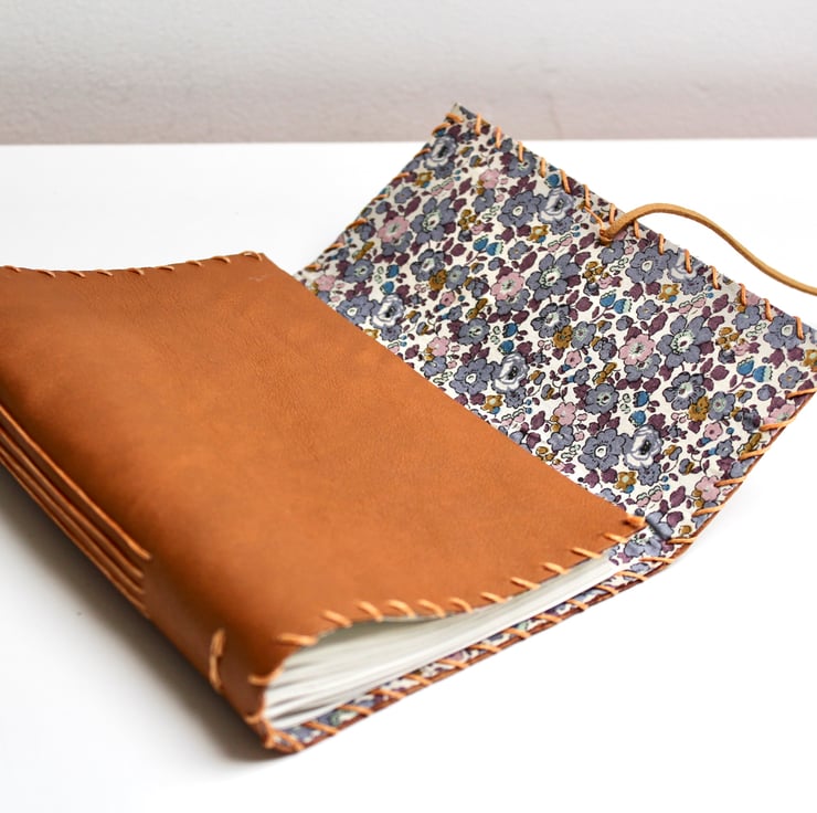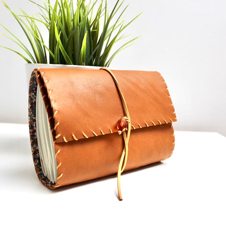 A gorgeous super soft light tan coloured leather with a lovely grey, beige, pink and purple floral fabric lining. The notebook is hand stitched around the edge with a matching thread and contains 200 blank sheets of plain recycled paper which are then hand stitched to the leather in 5 signatures. The notebook is fastened with a beige brown leather cord tied loosely at the front and finished with a large orange bead to complete the look.