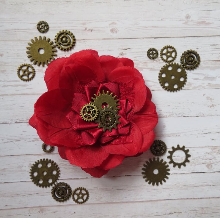 Created with a fabric rose flower with a ruby lace piece, a ruby red satin ribbon ruffle and a brass Steampunk cog detail in the centre.