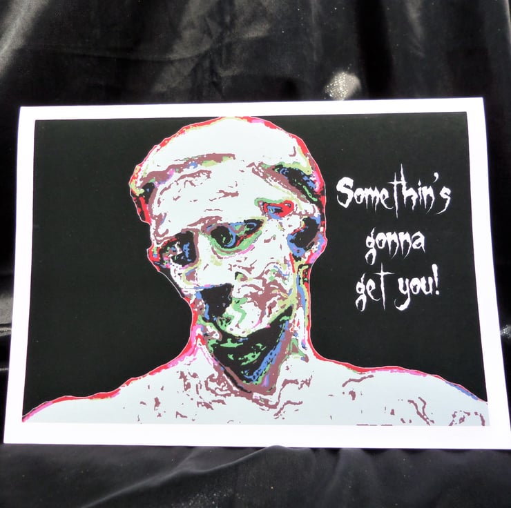 Created from one of my original photographs, the mummy started out as the very benign statue of Diadoumenos, an ancient Greek athlete (you can see him in his normal state on one of my other cards). Some digital sorcery, however, has made him look far scarier than usual and the ideal messenger to convey your Halloween forebodings.