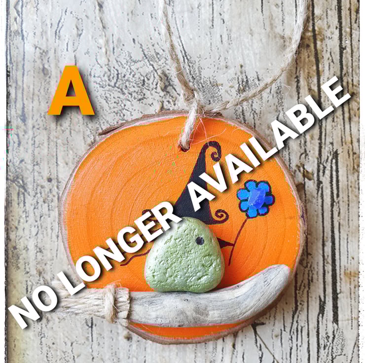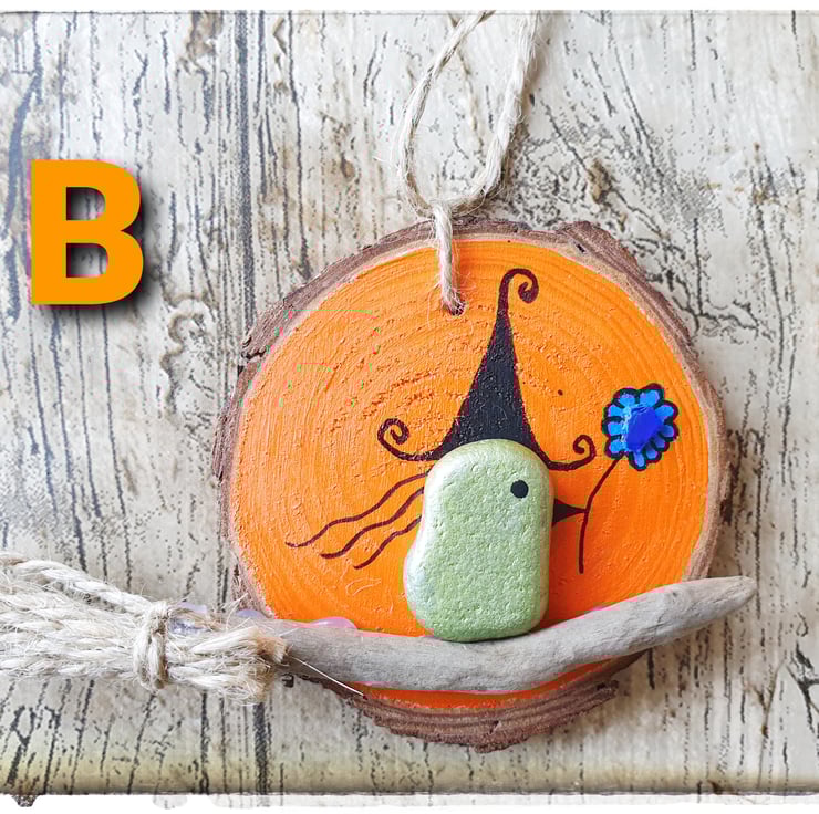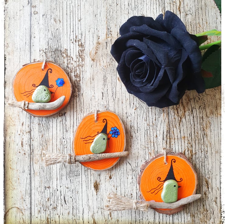 These cute seaglass witches are painted on for that "witchy" effect and are sitting on dritwood brooms. The witches are holding blue flowers created with one tiny blue seaglass each. The woodcut measures appropriately 6cm-7cm.