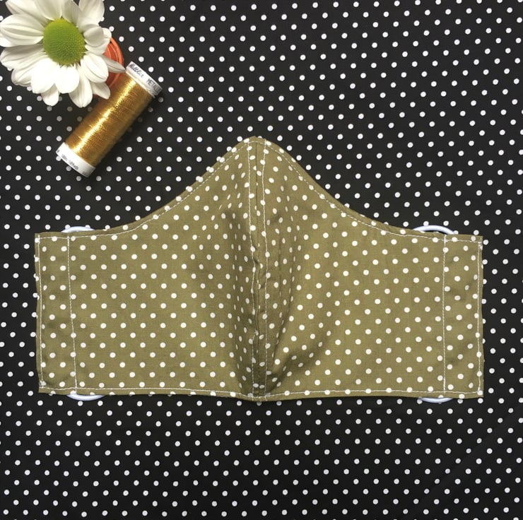 This is a 100% cotton fabric face mask, with a cotton lining. The outer fabric is a quality cotton dotted design and the lining is a high thread count soft cotton.