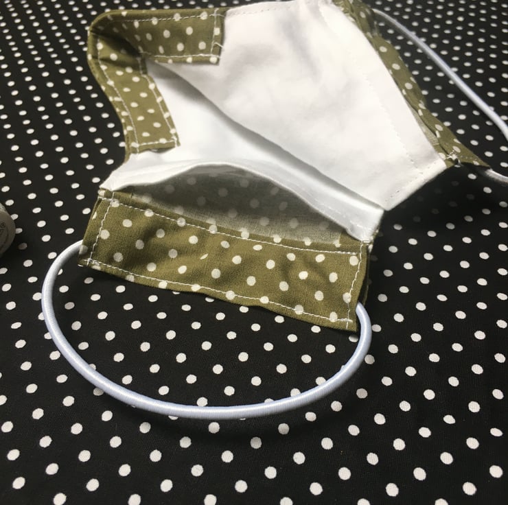 This mask is available in mossy green with white spots, black, turquoise or pink.