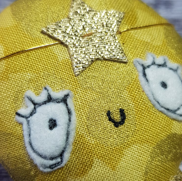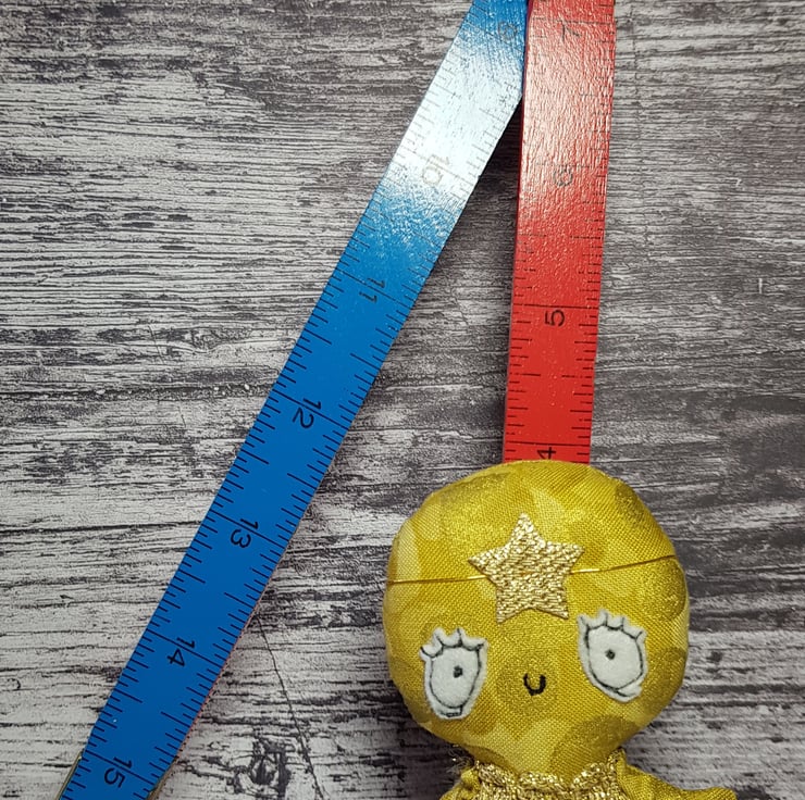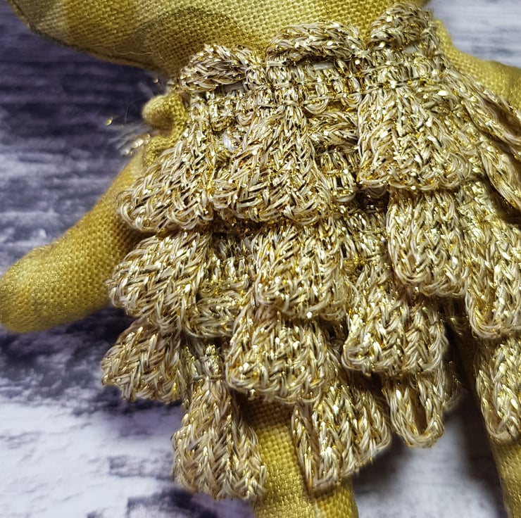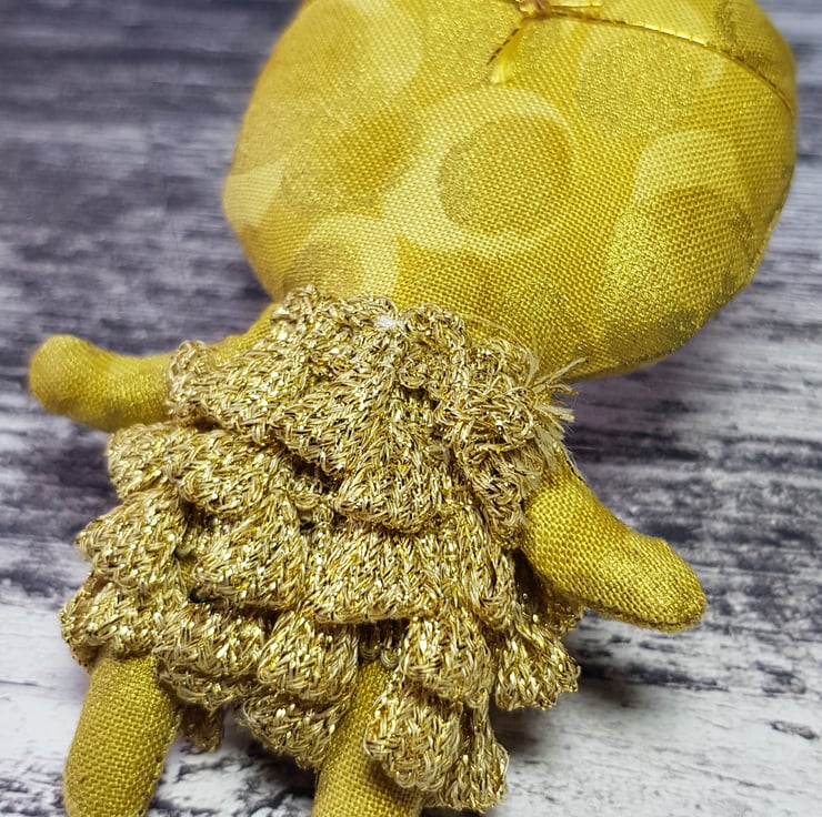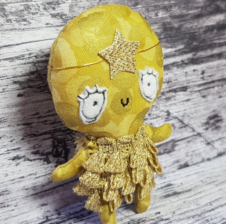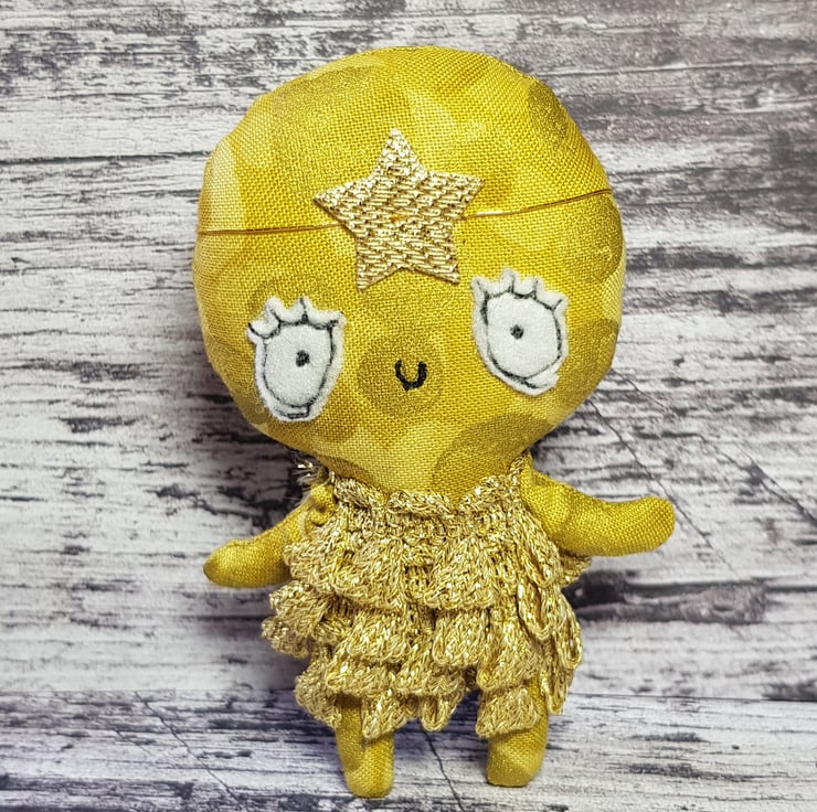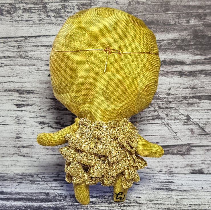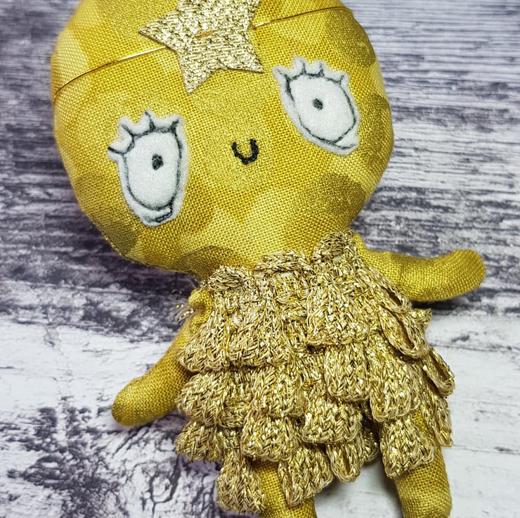 This Miniature sun beam is wearing vintage trim in a 20s flapper style. Solana has a sparkly star on gold thread head piece and her body is made from gold metallic cotton. She's a ray of sunshine with free motion embroidered face and waxed rosy cheeks. She measures roughly just under 4 inches tall and her clothes are sewn on.