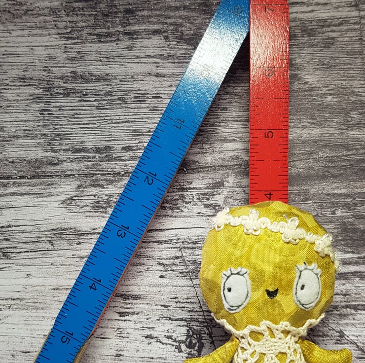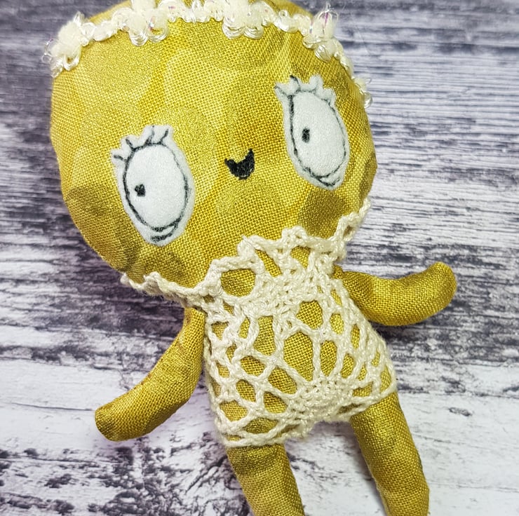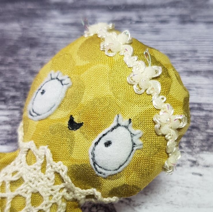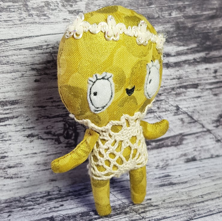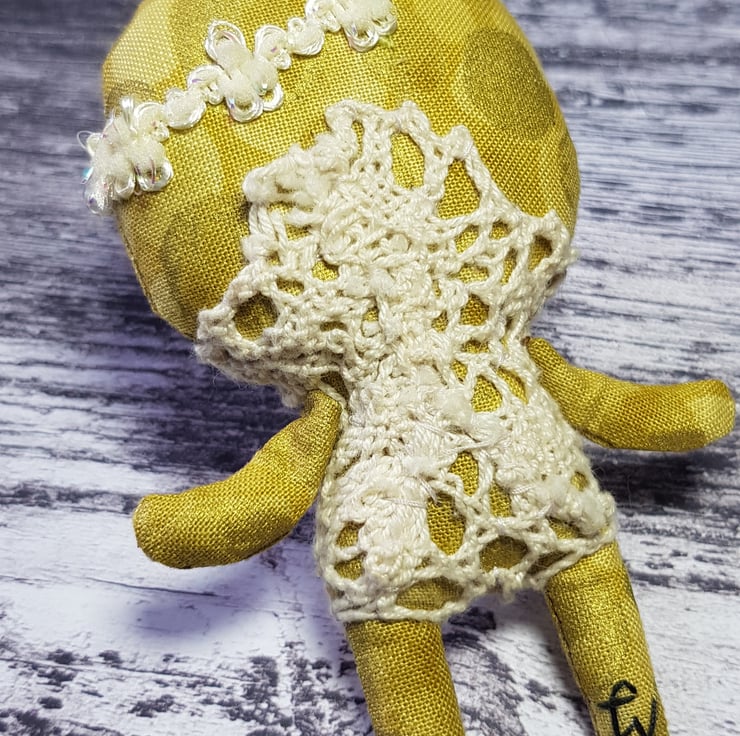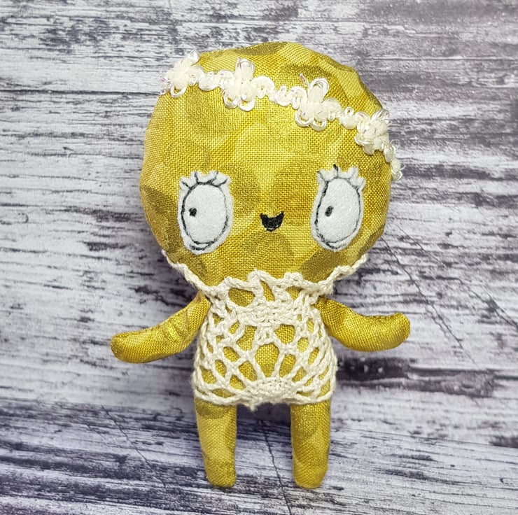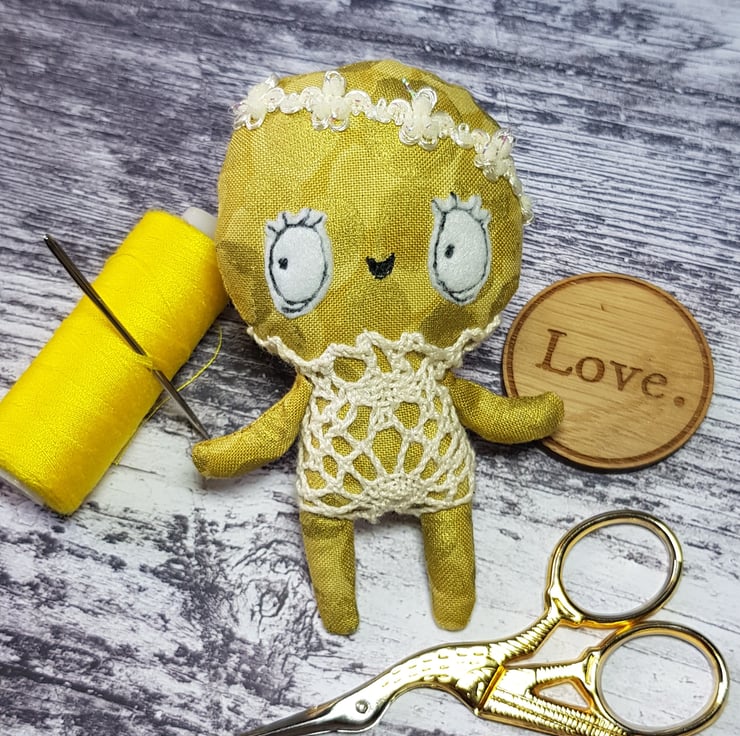 This little sunbeam wears a lace one piece in cream with sparkly trim headband. Kalinda has a free motion embroidered face with felt eyes and waxed rosy cheeks. Her clothes are not removable and she measures just under 4 inches tall. Her body is gold metallic cotton which shines in the light. She is made for decorative purposes only and not a toy. Spot clean only. Sent in recyclable packaging.