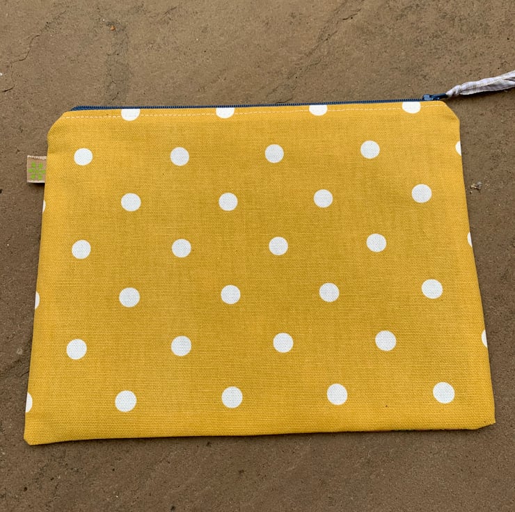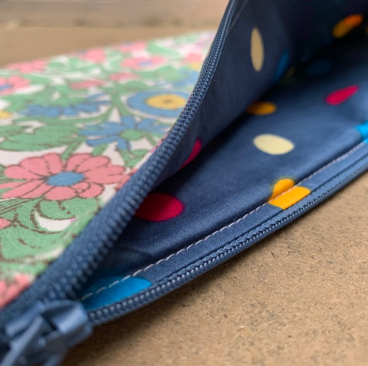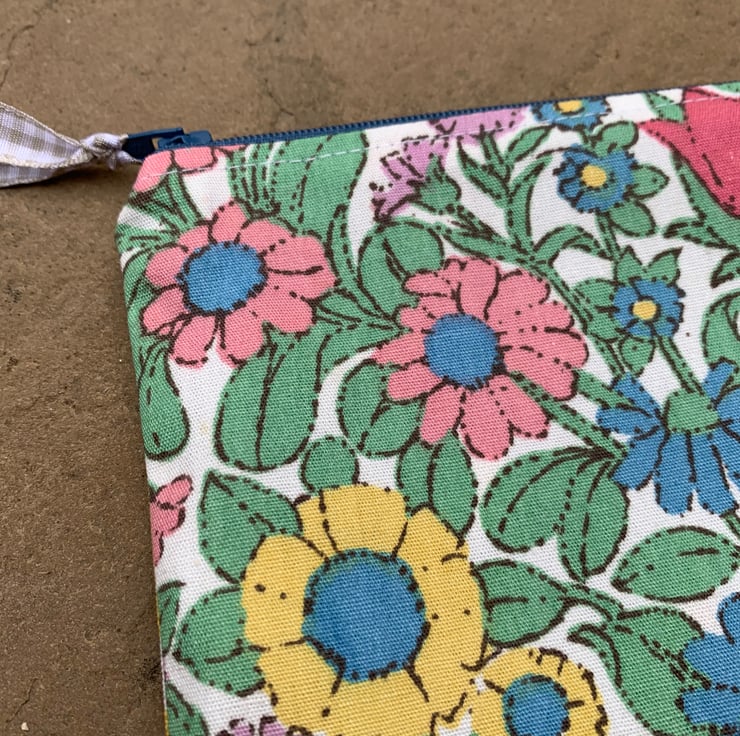 Beautiful zip pouch in vintage jonelle duracolour Daisy Chain cotton fabric, backed with yellow spotty cotton. The pouch is fully lined with blue spotty cotton.