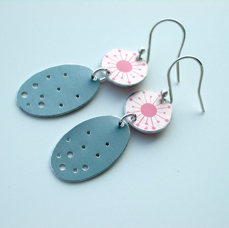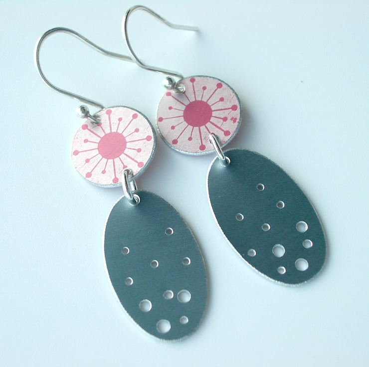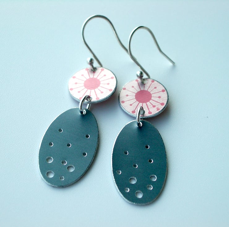 These unique earrings are made from anodised aluminium which I have dyed in burgundy and grey adding a silver starburst print and drilling holes of various sizes in a random pattern. The dye is made permanent and sealed in to the metal so that it is permanent.