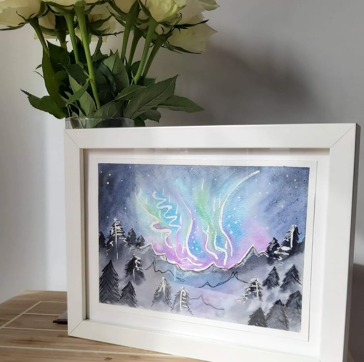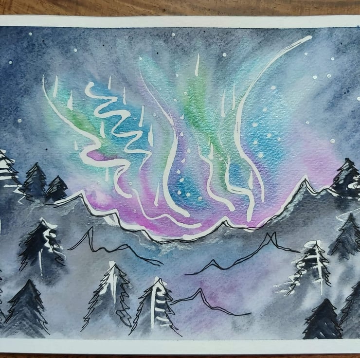 This A5 watercolour painting features the Northern Lights. I have used shimmering ink that catch the light beautifully and line art for detail.
