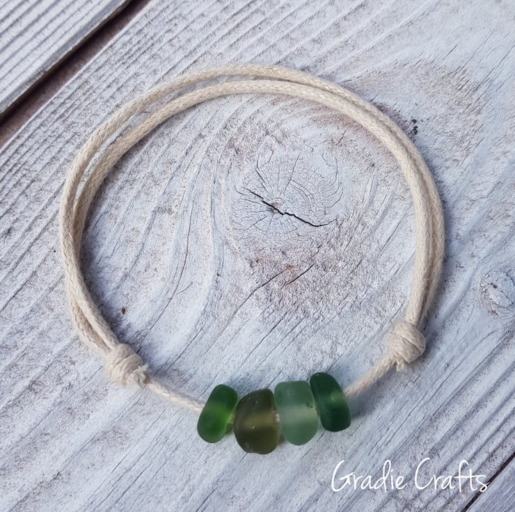 This simple but sweet bracelet is made with four beautifully tumbled, green seaglass nuggets hand drilled and threaded onto 2mm cream, cotton cord. Each piece is a different shade of green giving a nice variation in shades in different lighting.