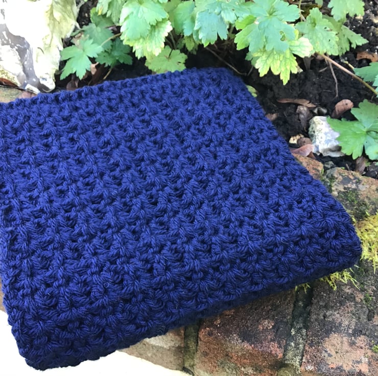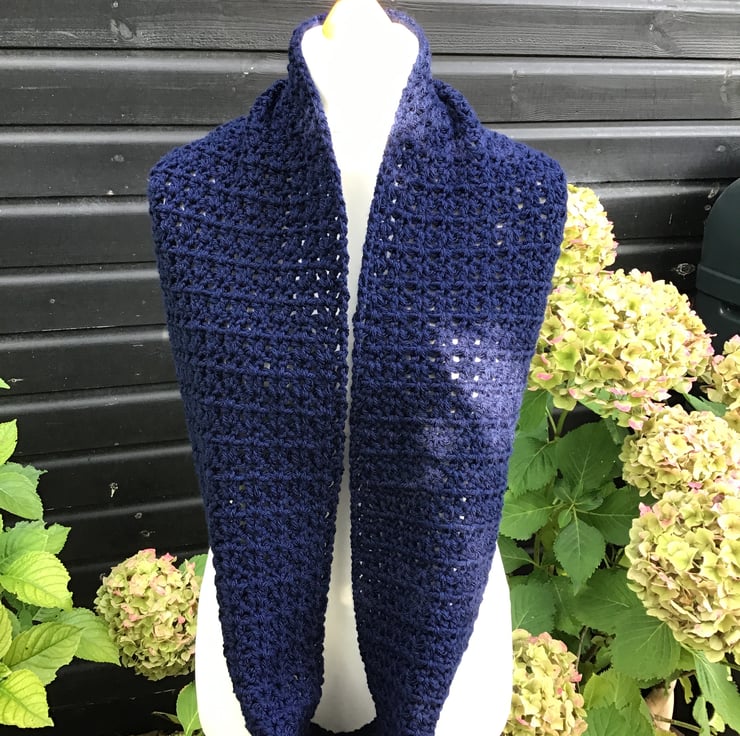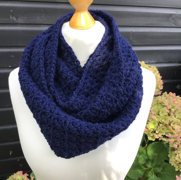 This infinity scarf / cowl measures approx 23cm (9”) wide x 153cm (60”) long. Enough to wrap around the neck twice. In a beautiful shade of midnight blue.