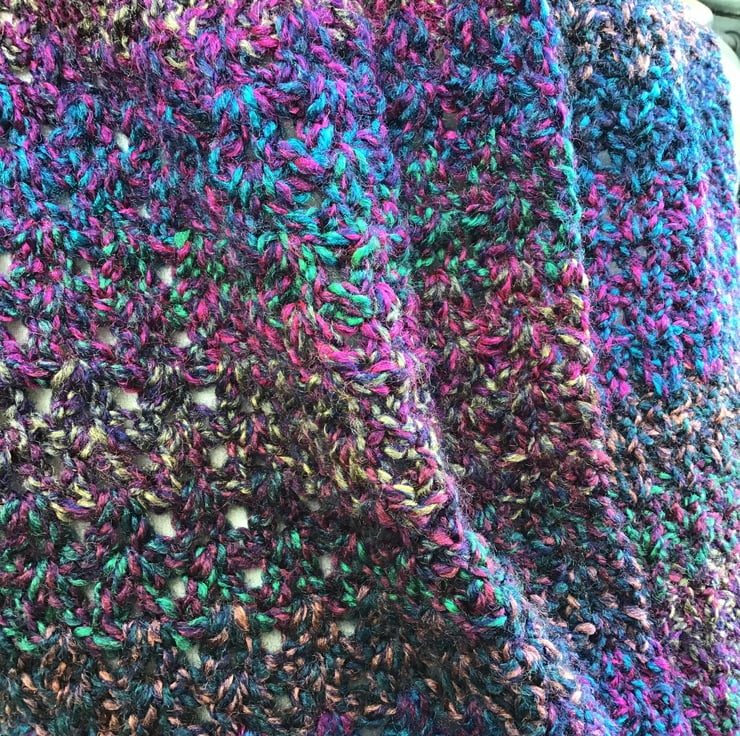 I choose yarns for their colour and texture. Both of which show up beautifully in this scarf.