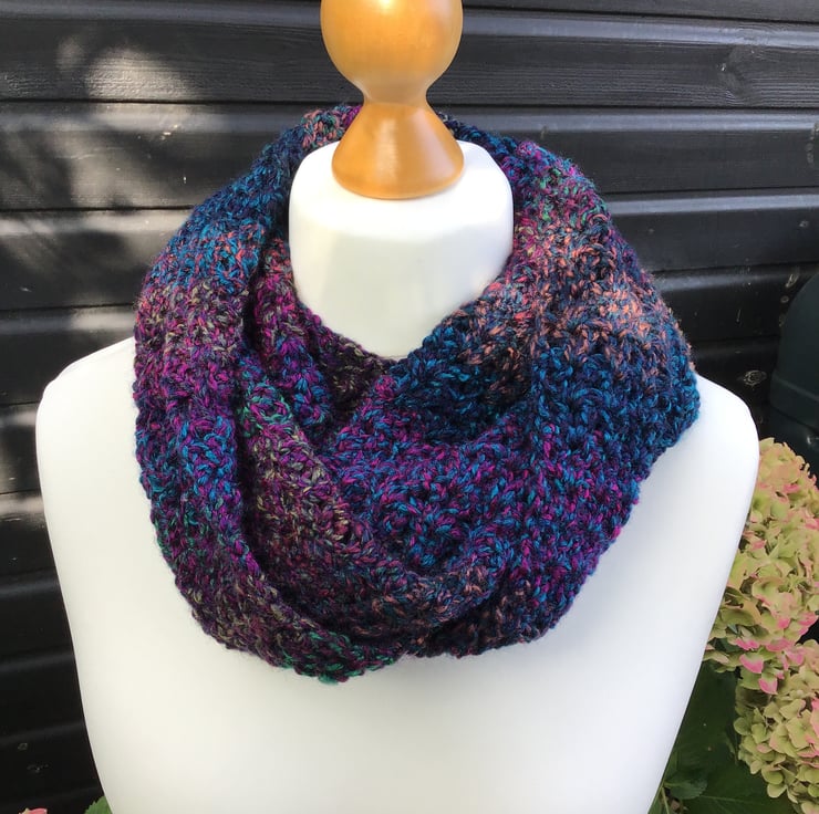 This infinity scarf / cowl measures approx 23cm (9”) wide x 137cm (54”) long. Enough to wrap around the neck twice,